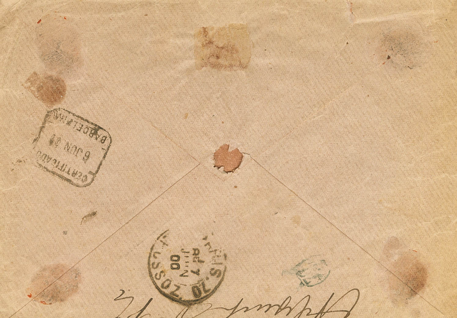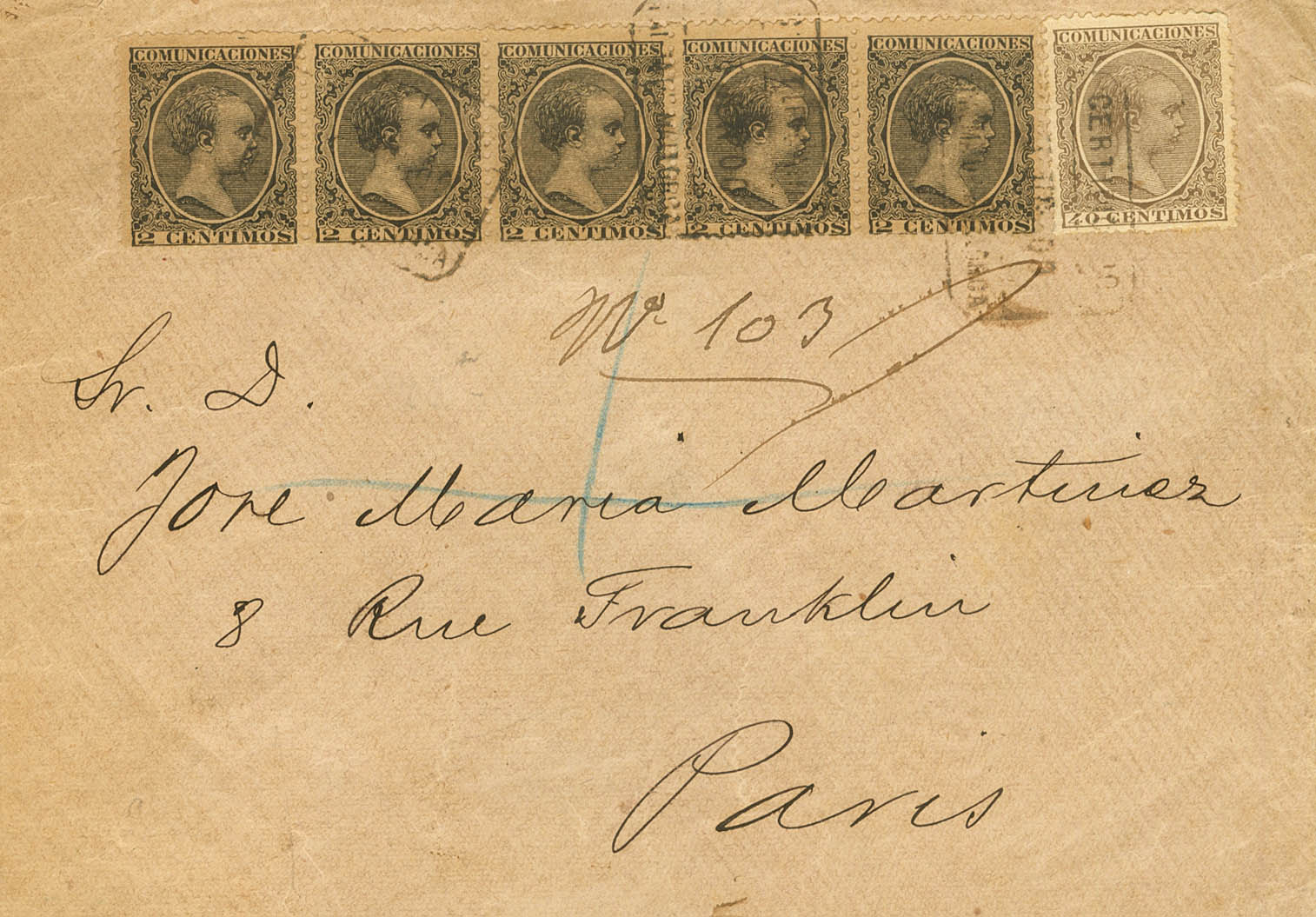 214(5), 223. 1900. 2 cts black, five stamps and 40 cts chestnut. Certificate from PALMA DE MALLORCA to PARIS (FRANCE). On the back arrival. MAGNIFICENT AND UNUSUAL POSTAGE COMBINATION.