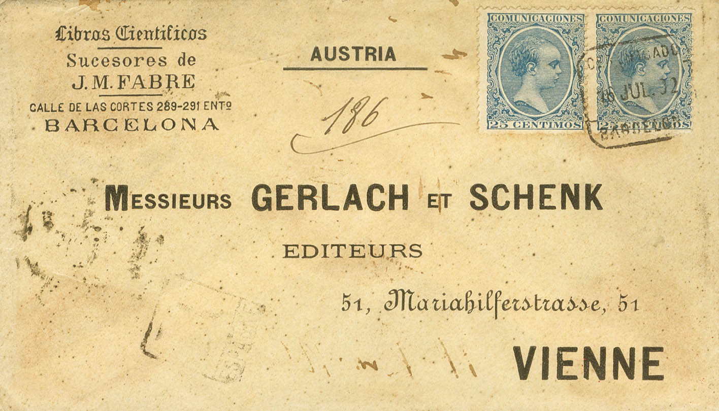 221(2). 1902. 25 cts blue, pair. BARCELONA certificate to VIENNA (AUSTRIA). CERTIFIED postmark / BARCELONA. On the back arrival. MAGNIFICENT AND UNUSUAL DESTINATION.