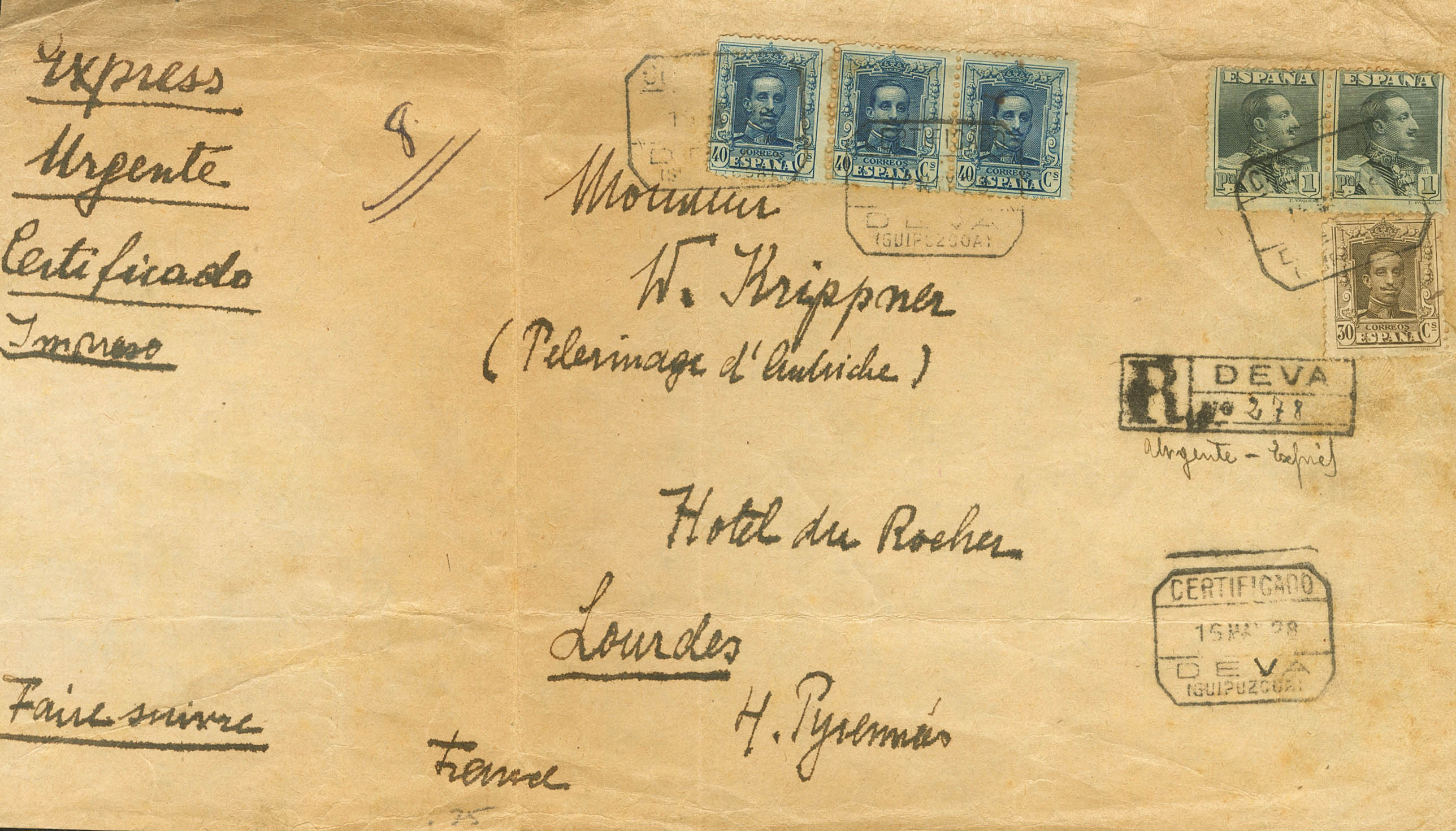 318, 319(3), 321(2). 1928. 30 cts chestnut, 40 cts blue, three values and 1 pts slate, two stamps. DEVA Certificate Front to LOURDES (FRANCE). CERTIFIED postmark / DEVA / (GUIPUZCOA). MAGNIFICENT.