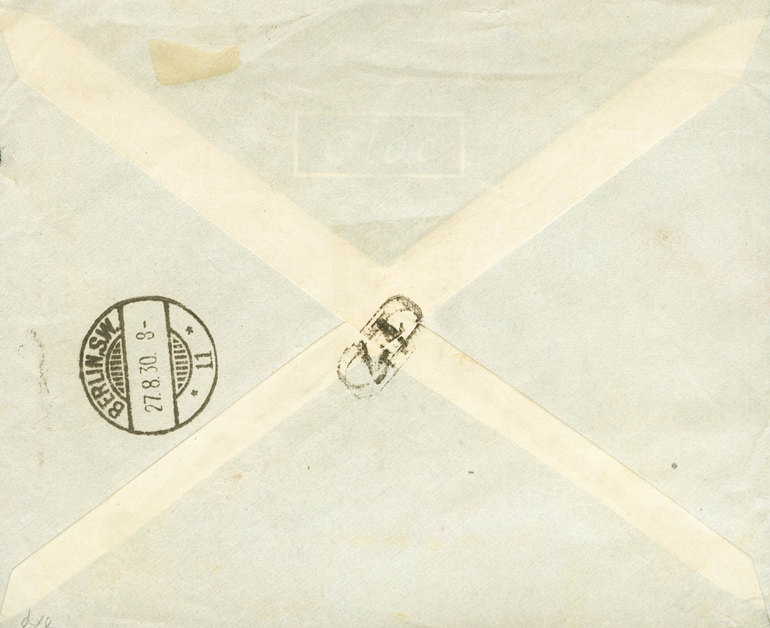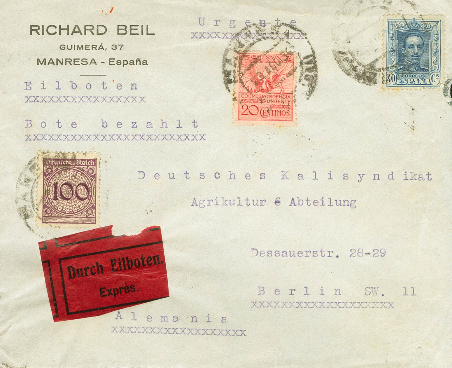 319, 454. 1930. 40 cts blue and 20 cts pink. Urgent Mail from ZARAGOZA to BERLIN (GERMANY). Priced upon arrival for lack of postage, applying a 100 m ordinary mail stamp and German urgency label. MAGNIFICENT AND RARE.