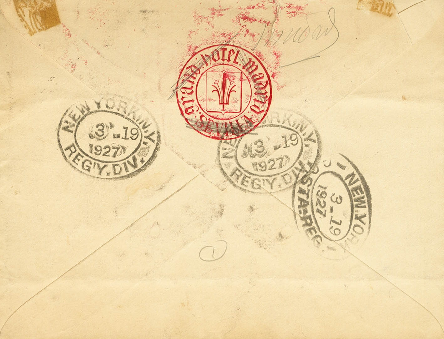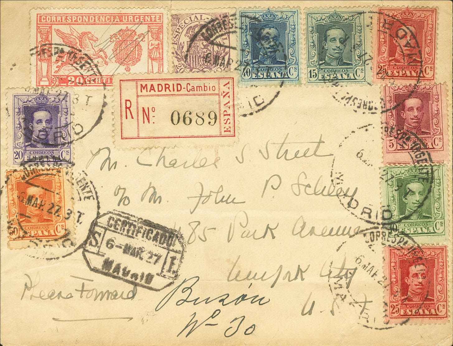 320. 1927. 50 cts orange, various values. Air Certificate from MADRID to NEW YORK (UNITED STATES). Postmark CORRESPº URGENTE / MADRID, on the back of arrival. MAGNIFICENT AND SPECTACULAR POSTAGE.