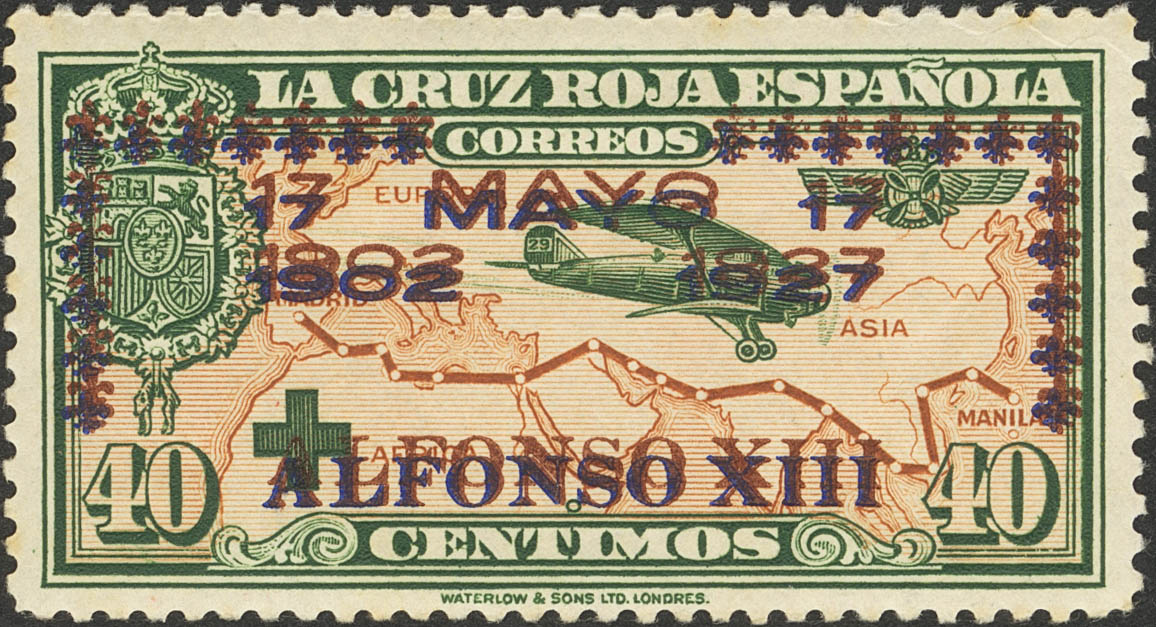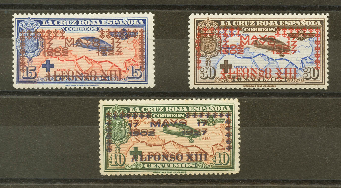 English ★ 365hh, 368hh, 369hh. 1927. 15 cts blue and orange, 30 cts chestnut and blue and 40 cts green and chestnut. DOUBLE OVERLOAD variety. MAGNIFICENT. Edifil 2015: 220 Euros