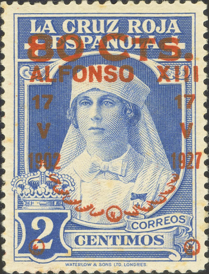 ★★ 382hz. 1927. 80 cts on 2 cts light blue. Variety OVERLOAD ERROR "80" INSTEAD OF "55". MAGNIFICENT AND RARE. Edifil 2015: +258 Euros