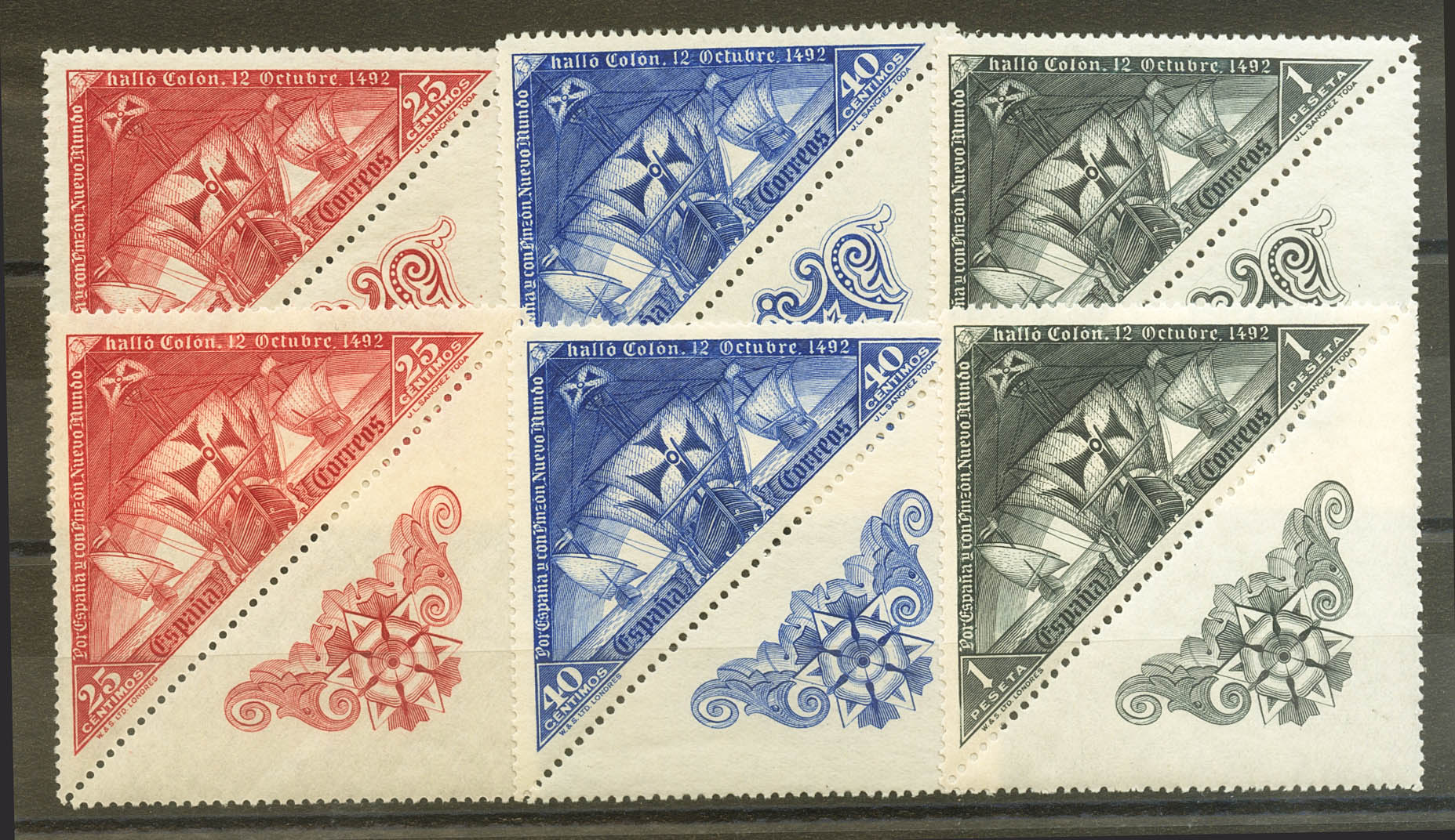 ★★ 539/43b, 539/43ba. 1930. 25 cts carmine, 40 cts ultramarine and 1 pts black, two stamps of each value with TYPES A and B DECORATIONS. MAGNIFICENT. Edifil 2020: 182 Euros
