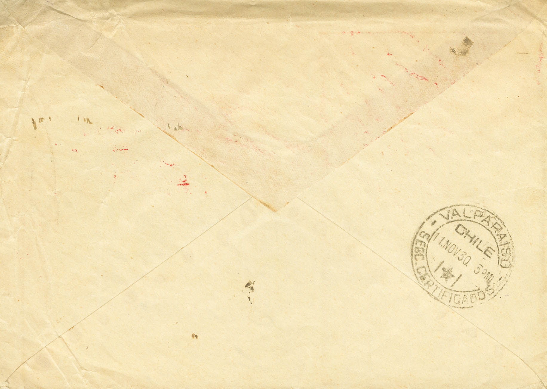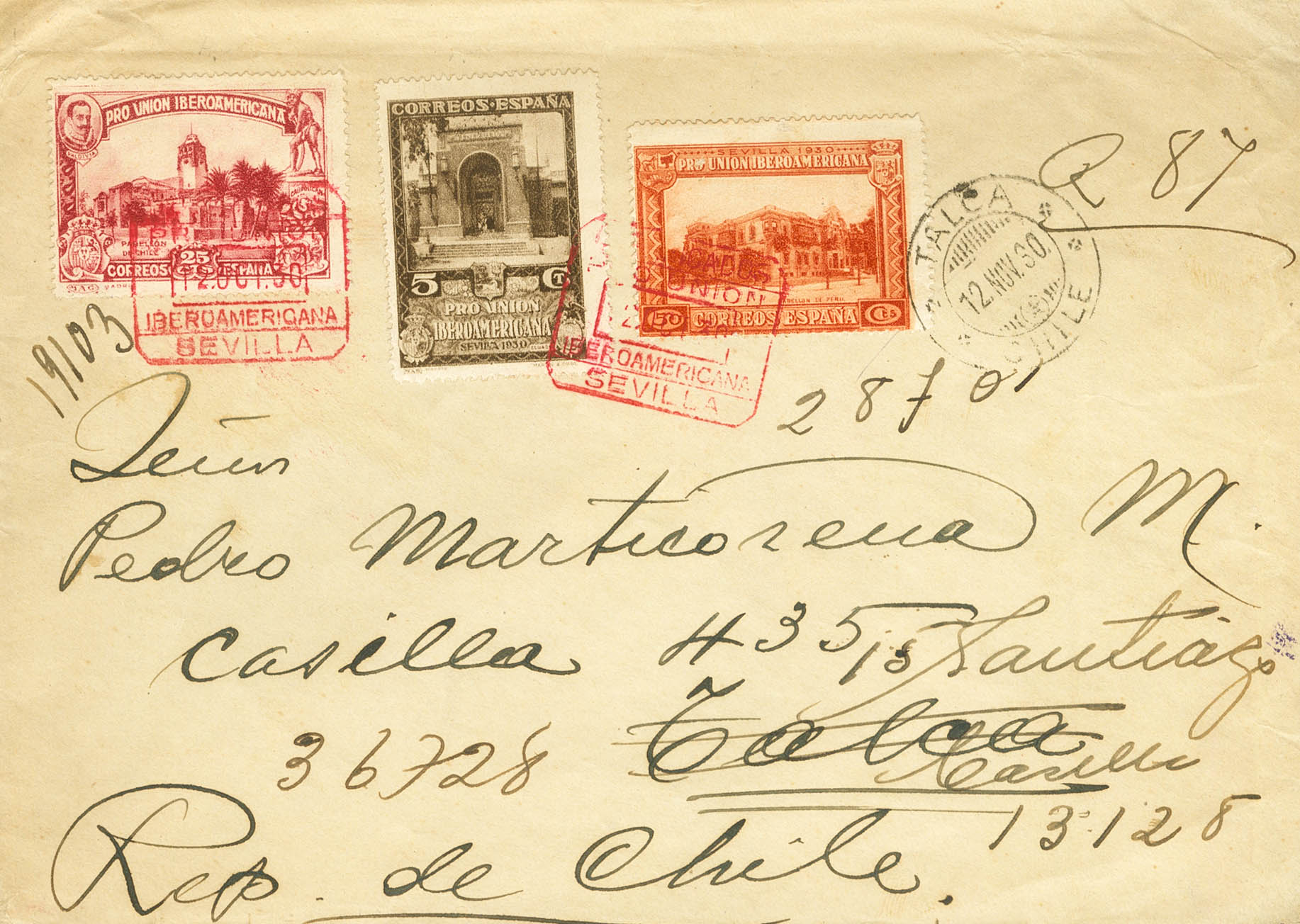 568, 572, 577. 1930. 5 cts blackish chestnut, 25 cts carmine and 50 cts orange. Certificate from SEVILLE to TALCA (CHILE). Postmark CERTIFICATES / PRO UNION / IBEROAMERICANA / SEVILLA, in red, arrival on the front and transit from Valparaíso on the back. MAGNIFICENT AND SPECTACULAR IN THIS COLOR.