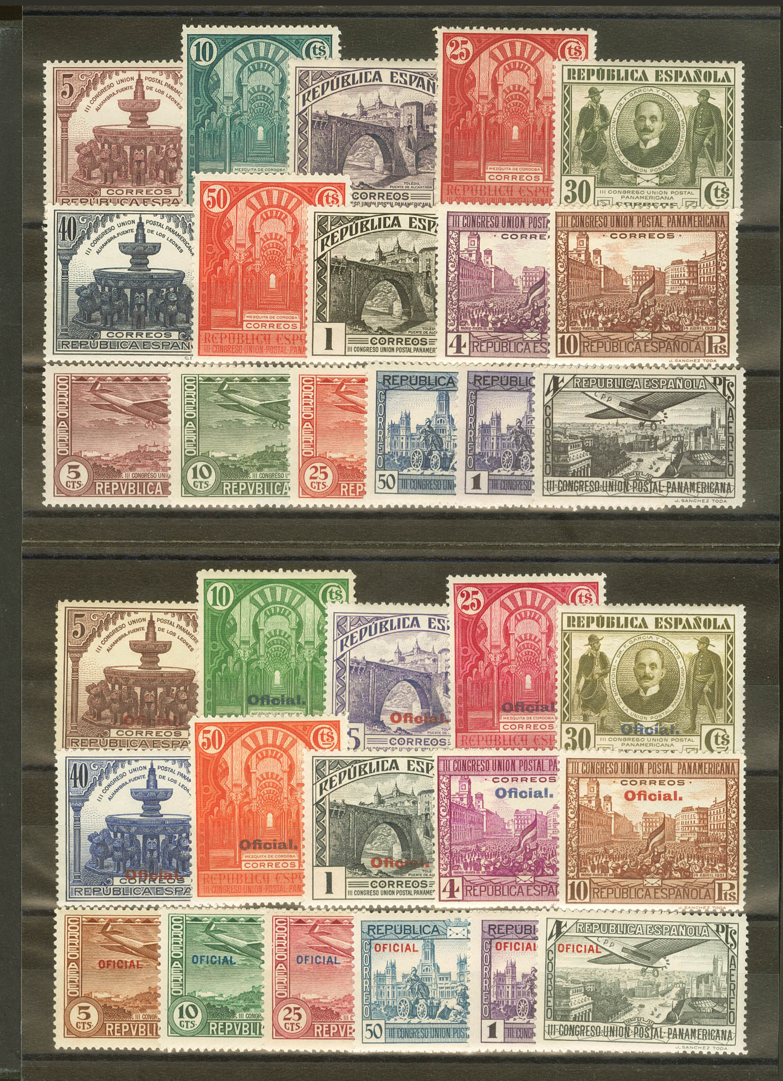 ★★ 604/13, 614/19, 620/29, 630/35. 1931. Set of four complete series of the Pan-American Postal Issue without overload (air and land) and with OFFICIAL overload, air and land (5 cts and 10 cts, series with overload, with stamp fixer). Most very well focused. MAGNIFICENT. Edifil 2023: 235 Euros