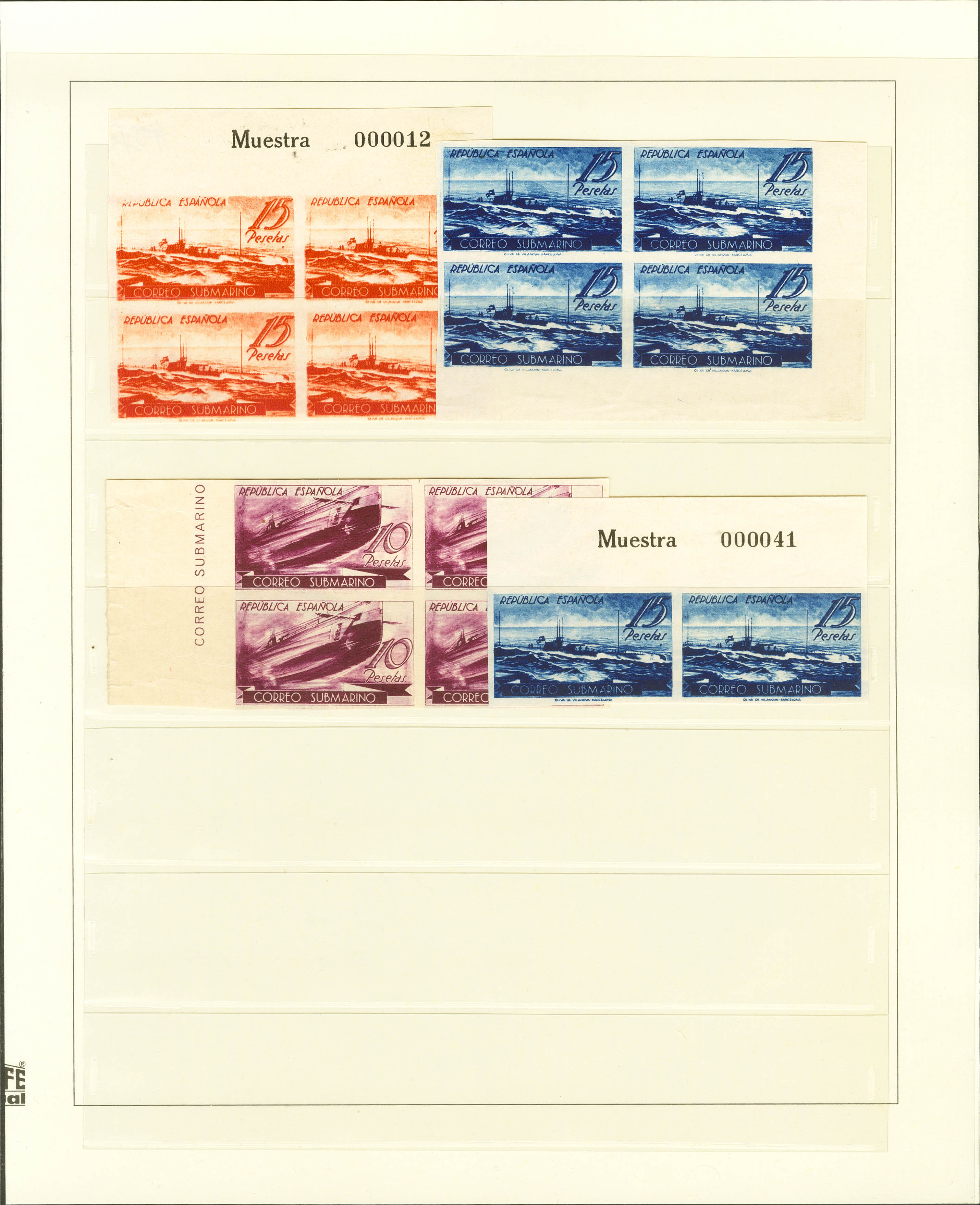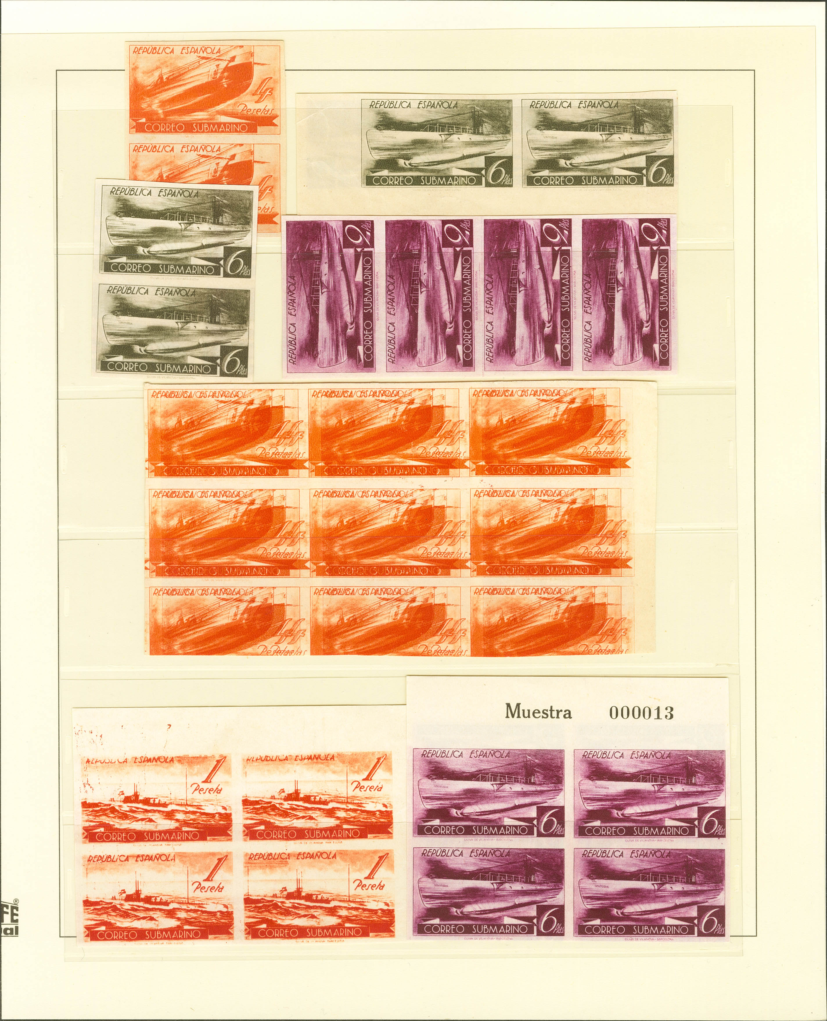 (★)1938. Interesting set of the Submarino series, all stamps UNTOOTHED, CHANGED COLORS and PRINTED ON MACULATURES, includes some variety. ESSENTIAL TO EXAMINE.