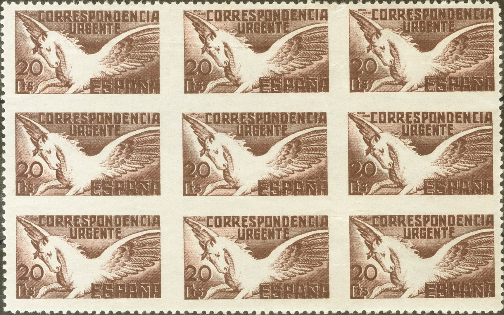 ★★ 861sbn. 1938. 20 cts chestnut, block of nine (small wrinkle in the upper stamps). NO TOOTHING BETWEEN THE SEALS. BEAUTIFUL AND RARE. Edifil 2021: 91 Euros