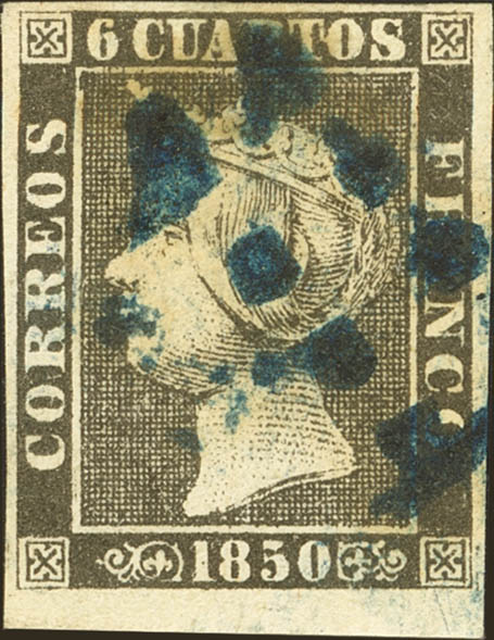 1A. 1850. 6 cuartos black, leaf edge. Postmark "11" (filed), in Sevilla blue. MAGNIFICENT, SPECTACULAR IN THIS QUALITY. CEM opinion.
