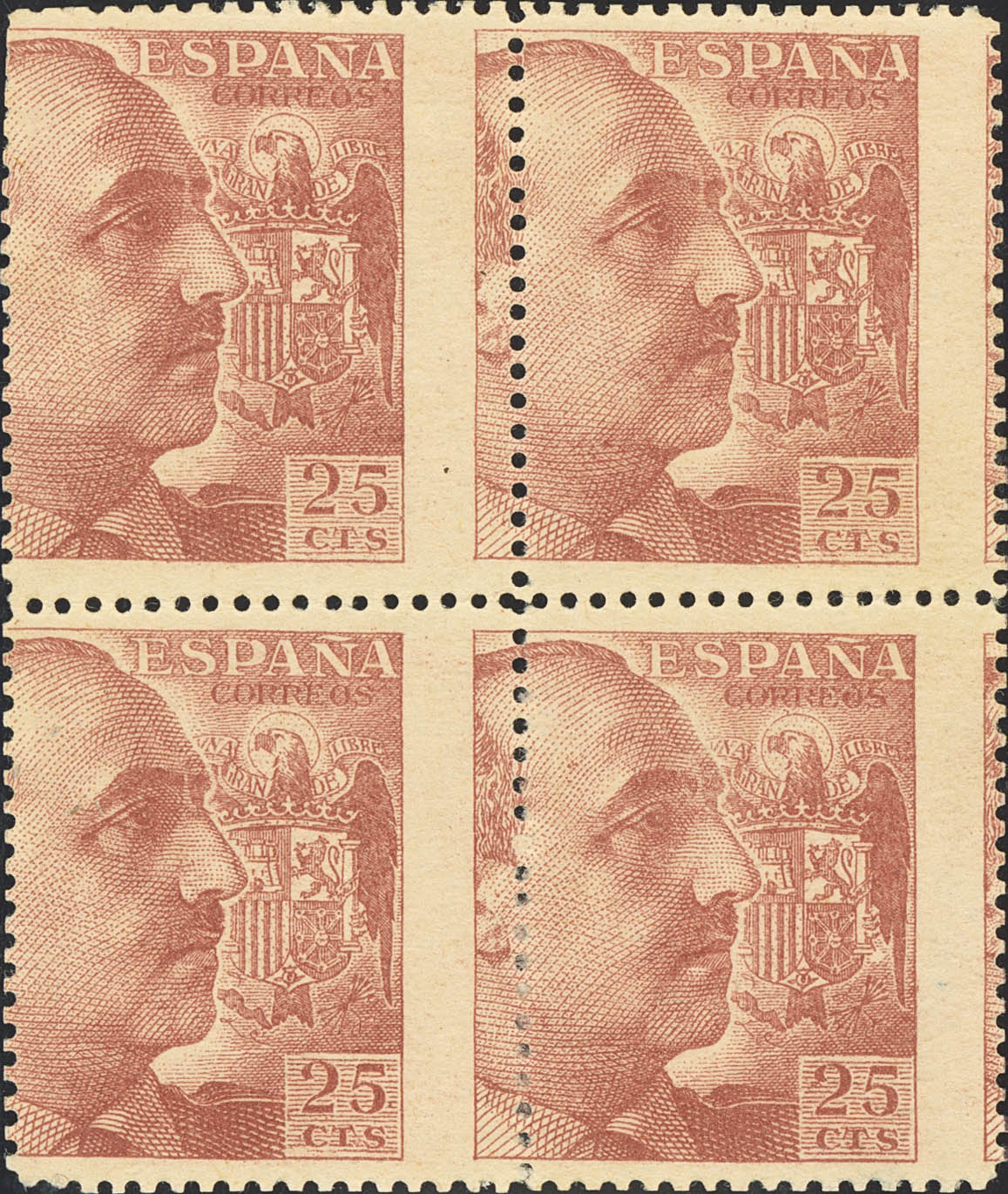 English (★) 923ccd(4). 1939. 25 cts reddish chestnut, block of four. COLOR CHANGE and PRINTED ON FRONT AND REVERSE. MAGNIFICENT AND RARE.