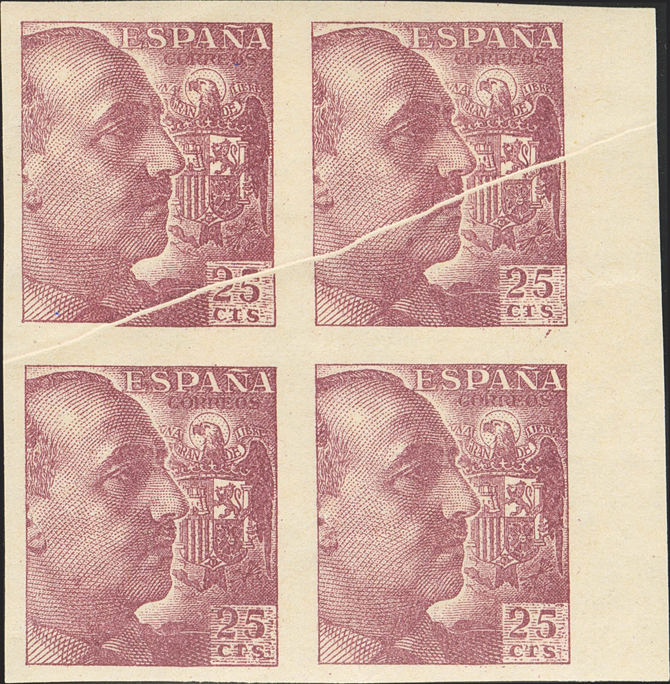 English ★★ 923. 1939. 25 cts lilac carmine, block of four. PAPER BELLOWS and UNTOOTHED. MAGNIFICENT, NOT CATALOGED.