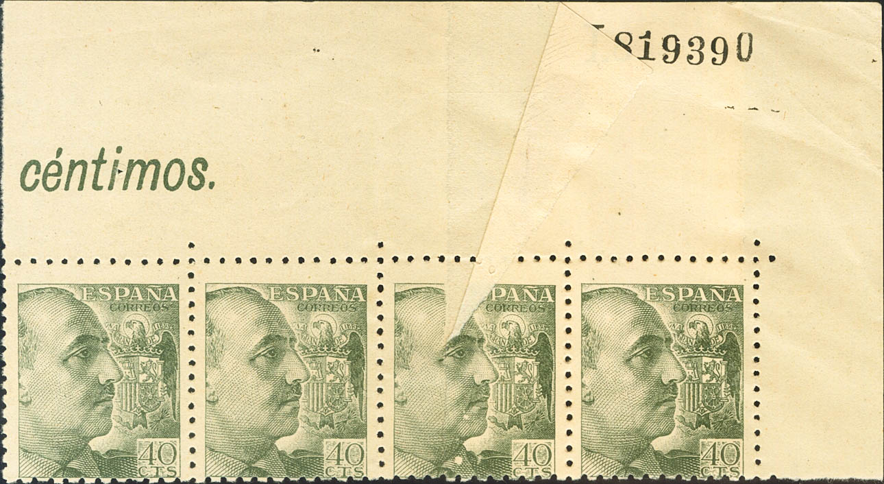 ★★/★ 925(2), 925x. 1940. 40 cts verde gris, tira de tres, esquina de pliego con número. Un sello variedad EMPALME DE PAPEL. MAGNIFICA Y ESPECTACULAR. Edifil 2024: +41 Euros