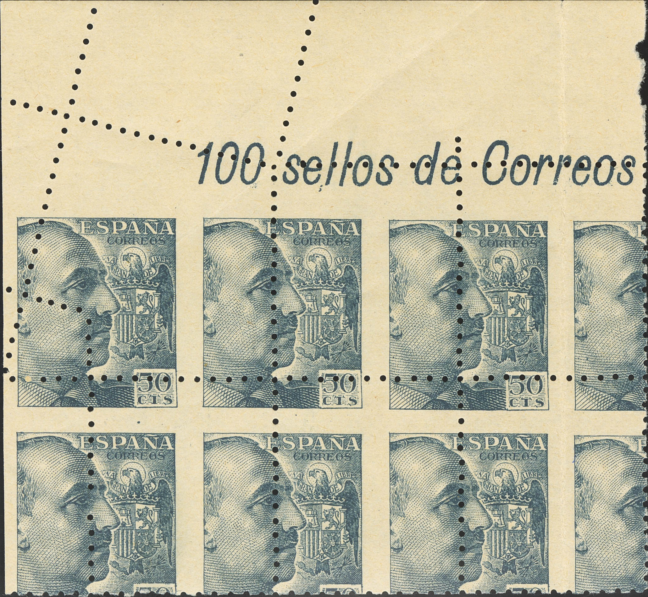 ★★ 927(8). 1939. 50 cts gray, block of eight, leaf edge. OFFSET TOOTH (one part diagonally). MAGNIFICENT AND RARE.