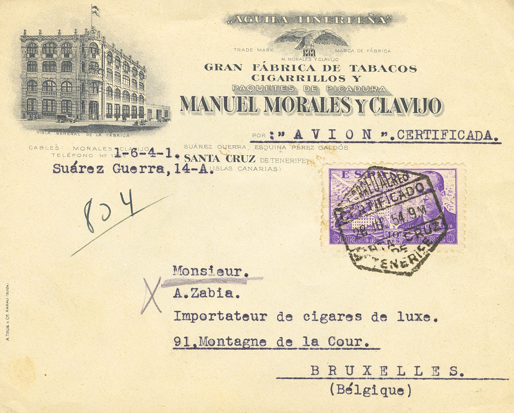 947. 1954. 10 pts lilac. Certificate from SANTA CRUZ DE TENERIFE to BRUSSELS (BELGIUM). MAGNIFICENT.