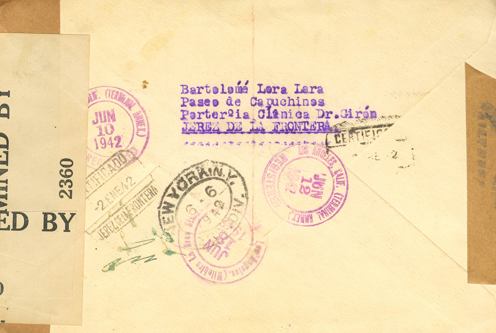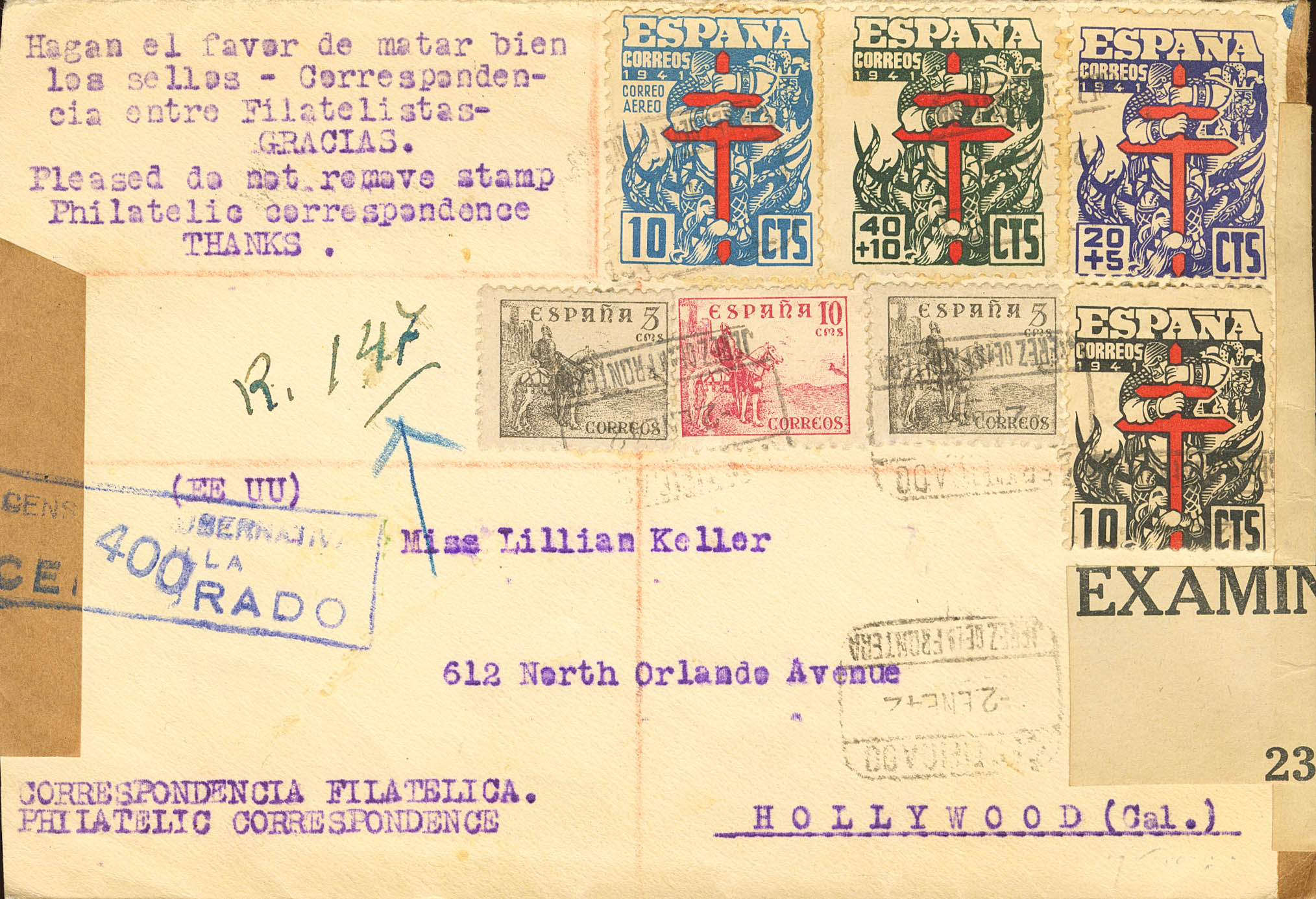 948/51, 916(2), 917. 1942. Complete series and various values. Certificate from JEREZ DE LA FRONTERA to HOLLYWOOD (USA). On the back arrival. MAGNIFICENT.