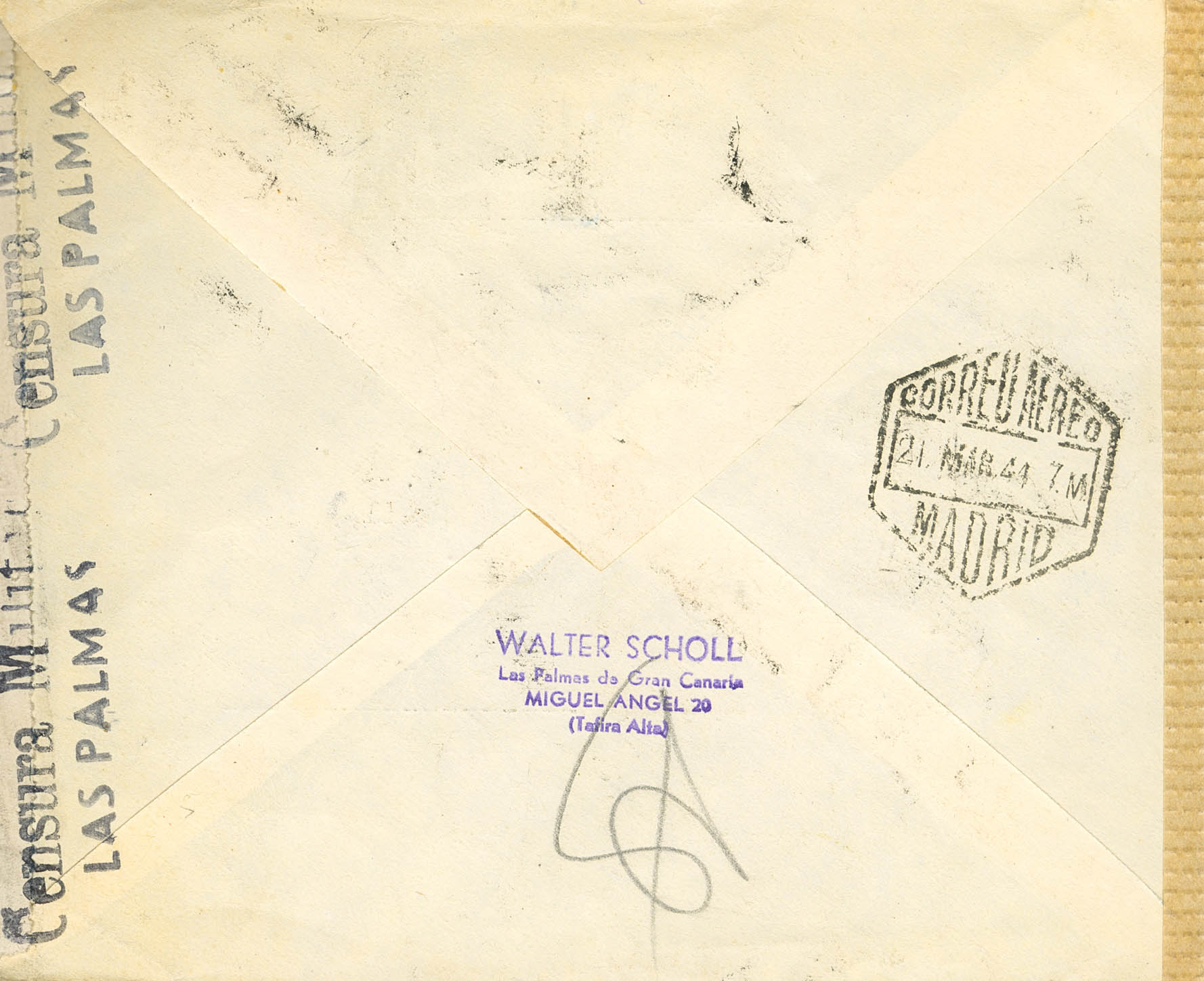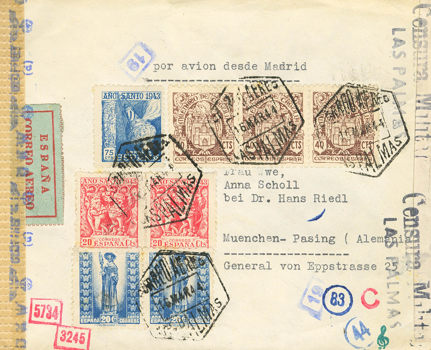 975. 1944. 40 cts castaño, diversos valores. Correo Aéreo LAS PALMAS a PASING-OBERMENZING (ALEMANIA). En el frente llegadas. MAGNIFICA Y ESPECTACULAR.