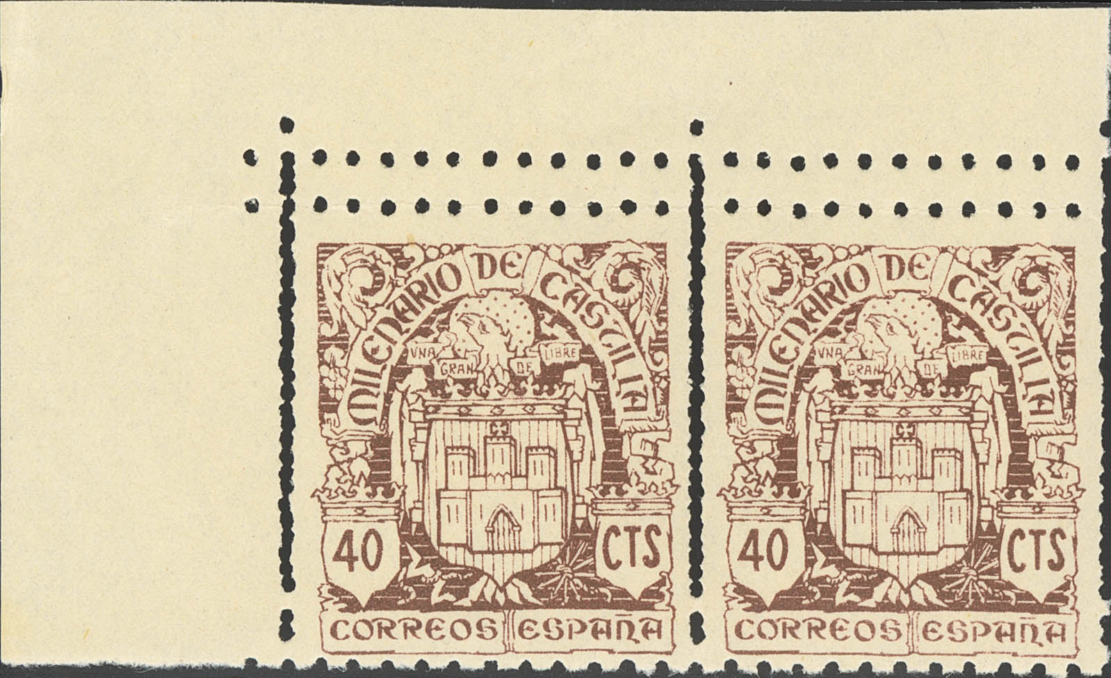 ★★ 975ddh. 1944. 40 cts chestnut, pair, corner of sheet. DOUBLE HORIZONTAL and VERTICAL TOOTHING. MAGNIFICENT AND SPECTACULAR. Edifil 2021: +++68 Euros