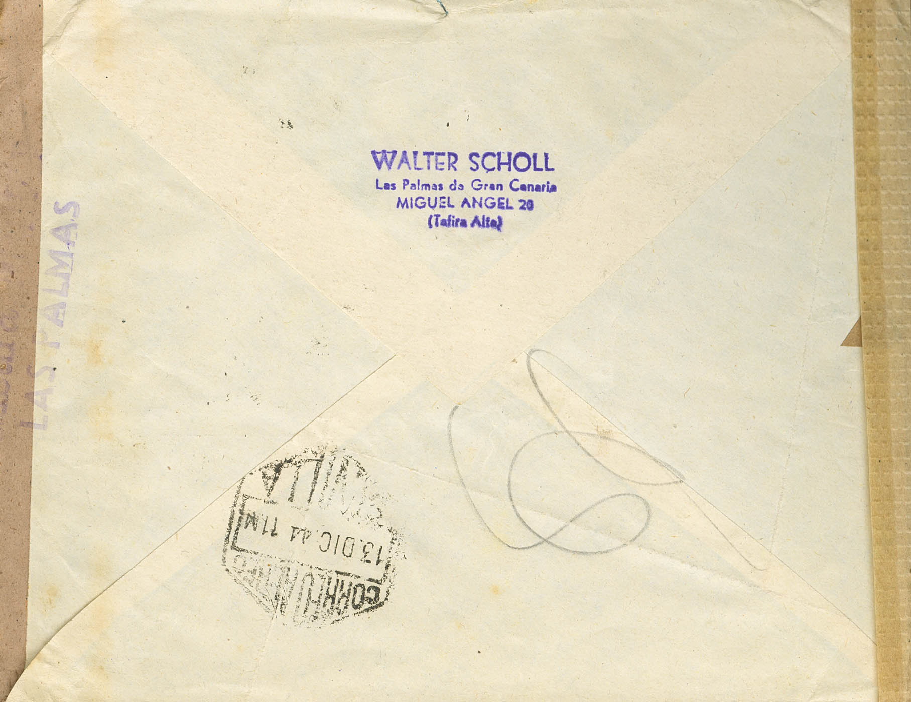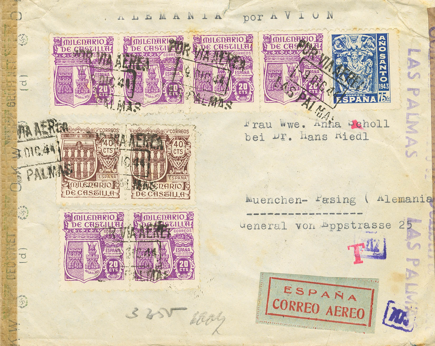 975. 1944. 40 cts chestnut, various values. Airmail LAS PALMAS to PASING-OBERMENZING (GERMANY). At the front arrivals. MAGNIFICENT AND SPECTACULAR.