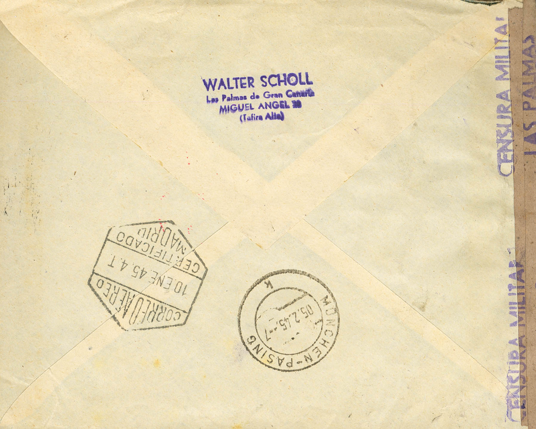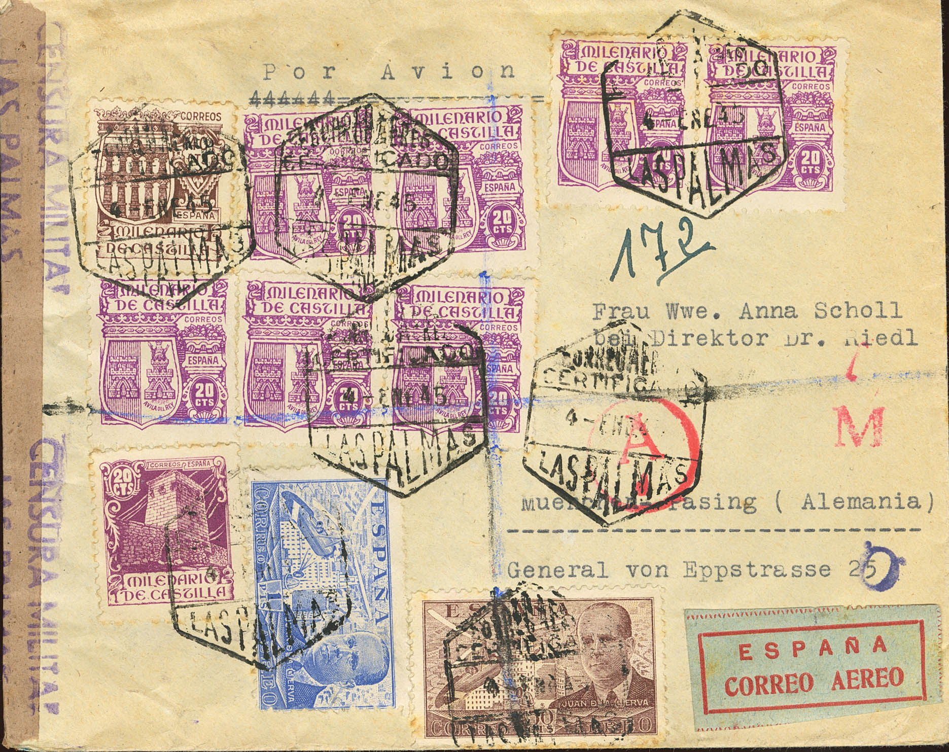 975. 1944. 40 cts chestnut, various values. Certified Air Mail LAS PALMAS to PASING-OBERMENZING (GERMANY). At the front arrivals. MAGNIFICENT AND SPECTACULAR.