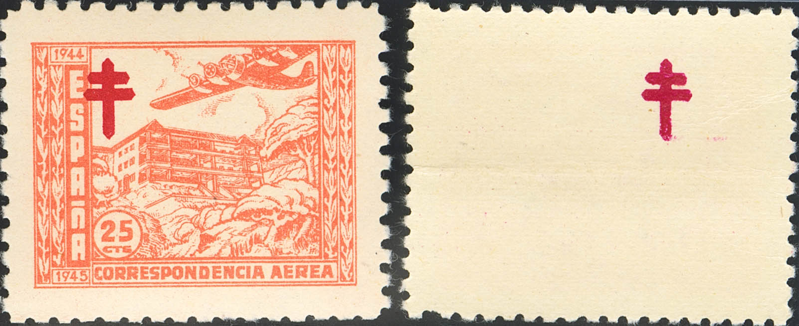 ★★ 988, 988ic. 1944. 25 cts naranja, dos sellos. Cruz de Lorena DESPLAZADA A LA IZQUIERDA y CALCADA AL DORSO. MAGNIFICOS.
