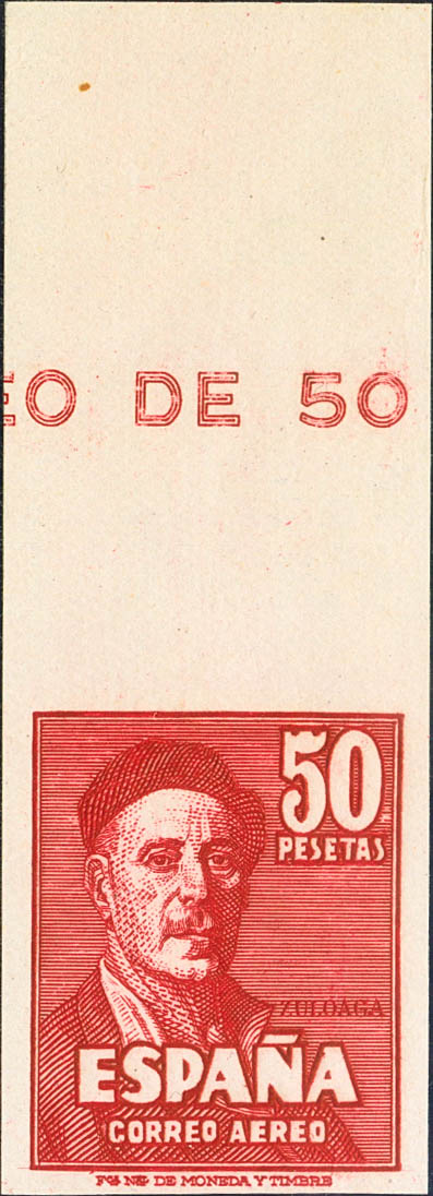 ★★ 1016s. 1947. 50 pts carmín, borde superior de hoja. SIN DENTAR. MAGNIFICO Y PIEZA DE ENORME ESPECTACULARIDAD. Cert. CEM. Edifil 2024: +++1.620 Euros