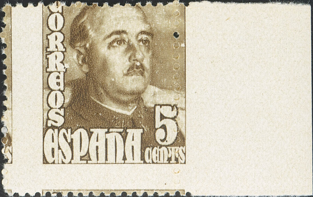 ★ 1020. 1948. 5 cts chestnut, leaf edge. DISPLACED VERTICAL TOOTH. MAGNIFICENT AND SPECTACULAR, NOT CATALOGED.