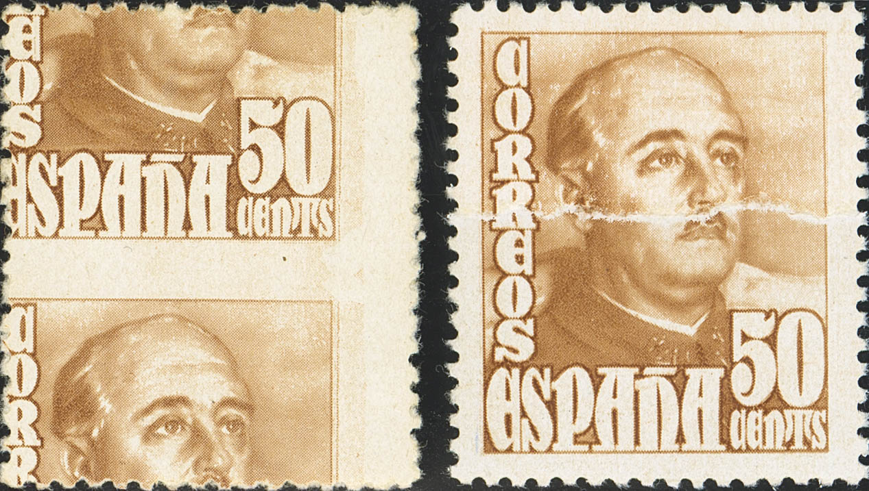 ★★ 1022dh, 1022x. 1948. 50 cts chestnut, two stamps. OFFSET HORIZONTAL TEETH and PAPER SPLICE. MAGNIFICENT. Edifil 2021: 80 Euros