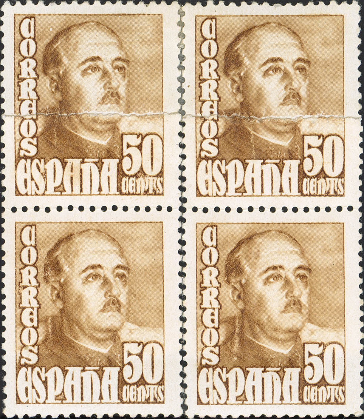 ★ 1022(2), 1022x(2). 1948. 50 cts light brown, block of four (detached teeth). Two variety stamps by PAPER SPLICE. MAGNIFICENT.
