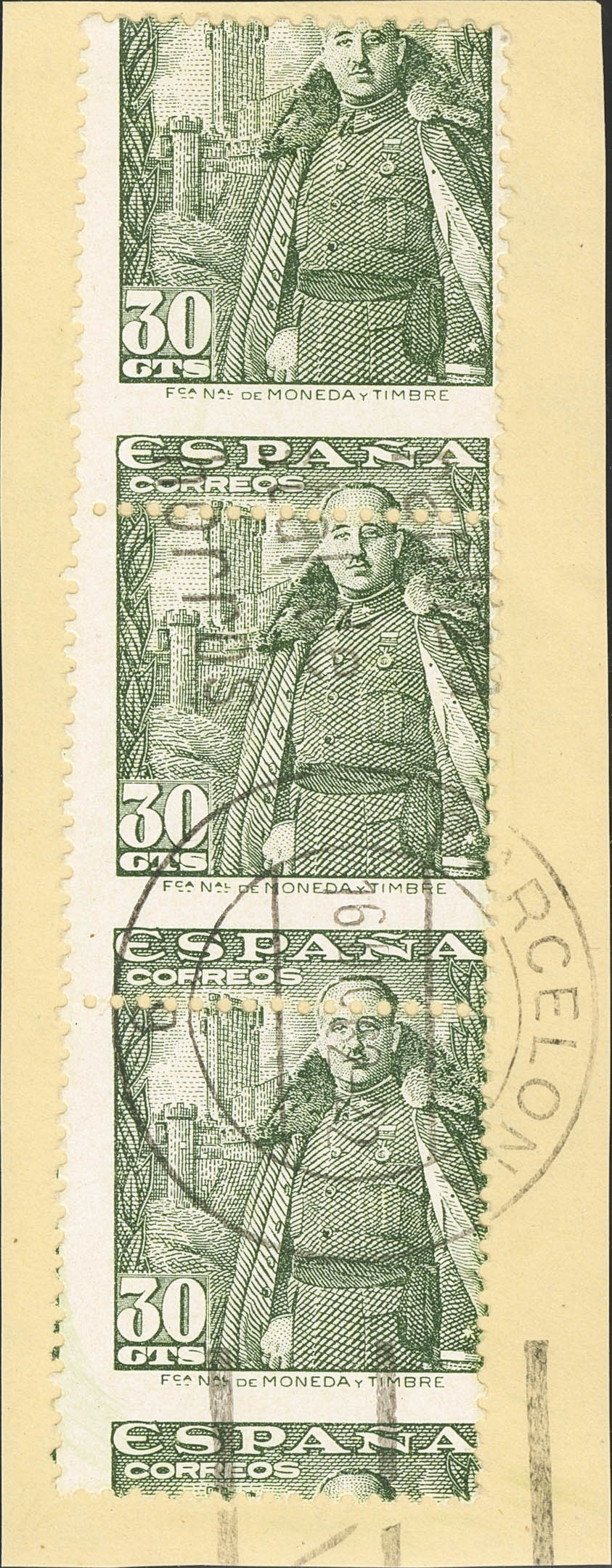 1025dh(3). 1948. 30 cts verde oliva, tira de tres, sobre fragmento. DENTADO HORIZONTAL DESPLAZADO. MAGNIFICA.