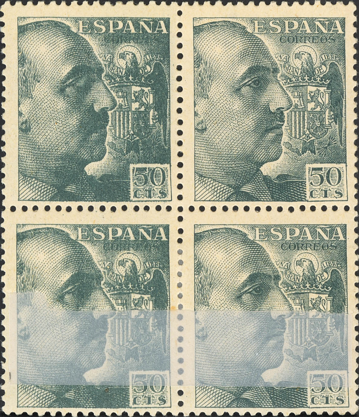 ★★/★ 1053x(4). 1949. 50 cts gris, bloque de cuatro. Variedad por EMPALME DEL PAPEL. MAGNIFICO.