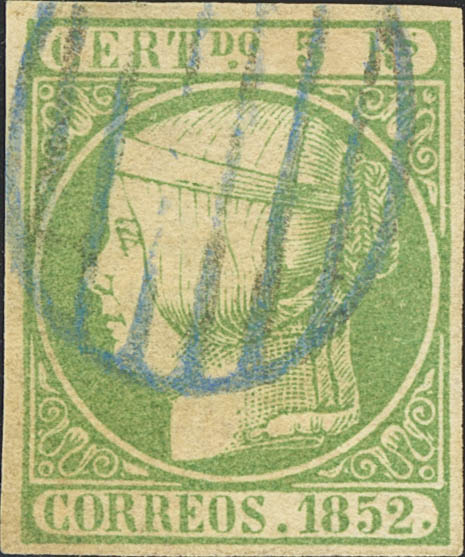 English 15. 1852. 5 reales green. PARRILLA postmark, in blue. MAGNIFICENT.