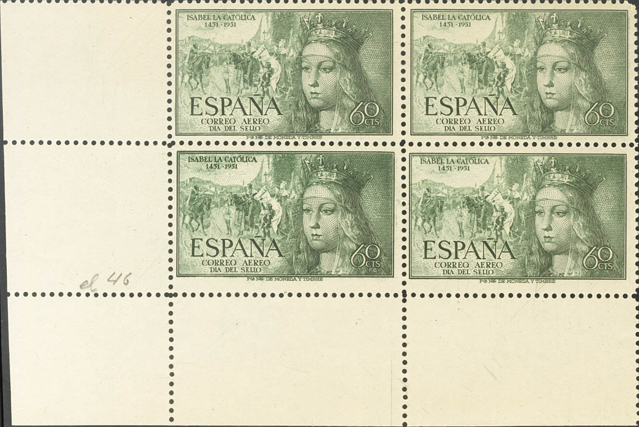 English ★★ 1097(3), 1097t. 1951. 60 cts green, block of four, sheet corner (first stamp). A DOUBLE TRANSFERRED variety stamp. MAGNIFICENT. Edifil 2021: +++65 Euros