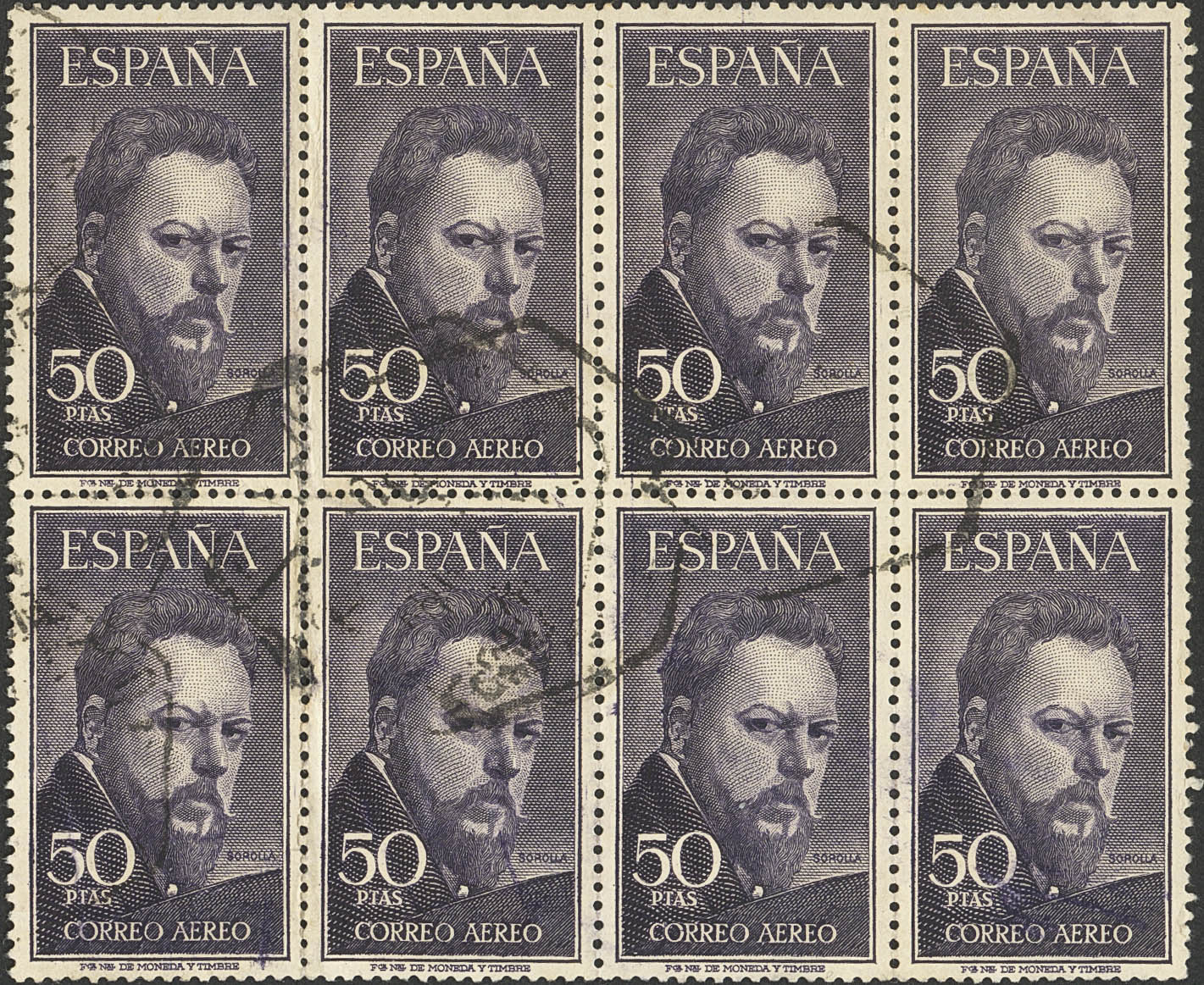1125(8). 1953. 50 sts purple black, block of eight. MAGNIFICENT AND RARE. Edifil 2023: +200 Euros