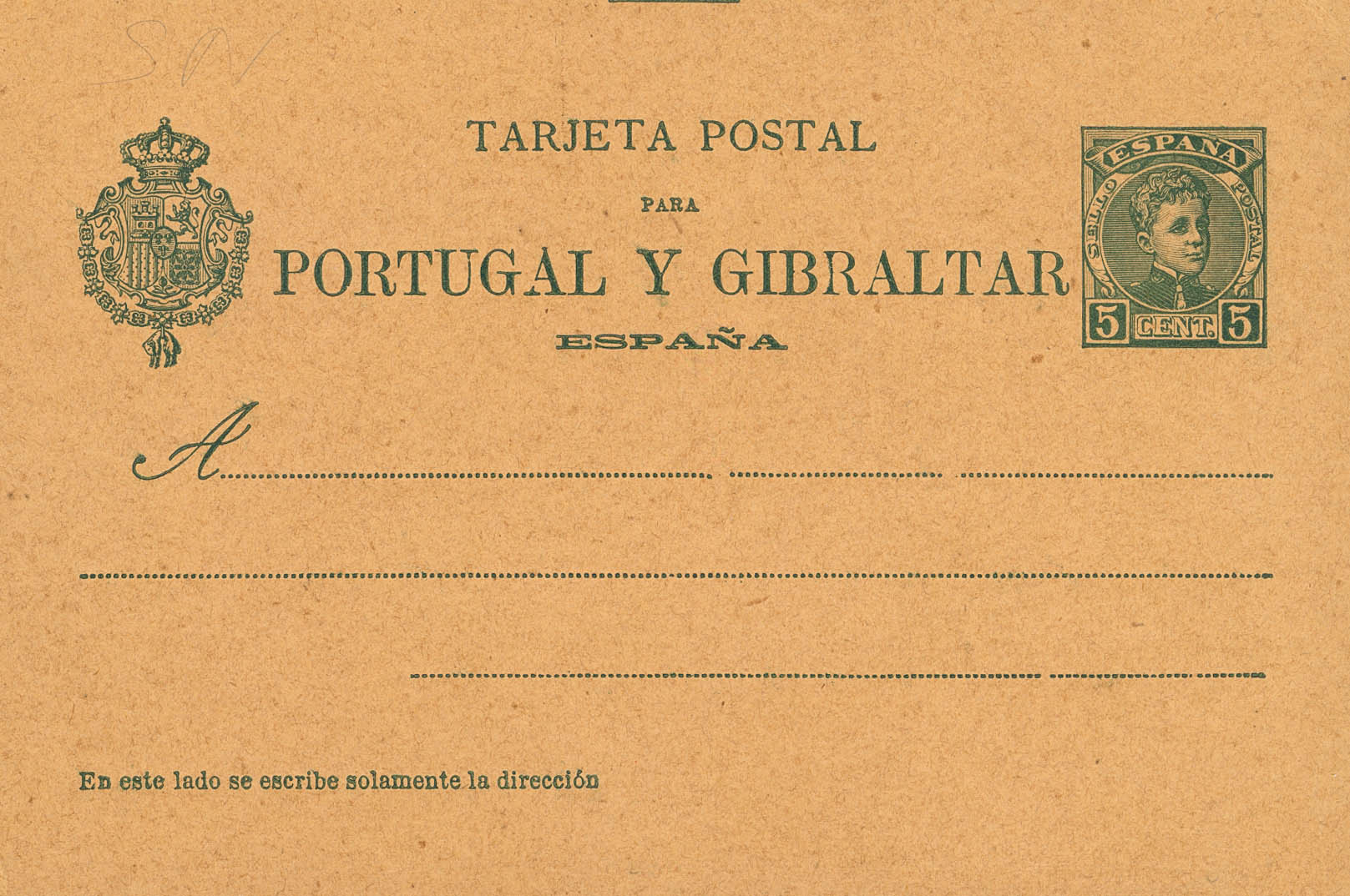 (★) EP43SN. 1903. 5 cts green on Whole Postal Card WITHOUT NUMBERING. MAGNIFICENT AND VERY RARE. Edifil 2017: 935 Euros