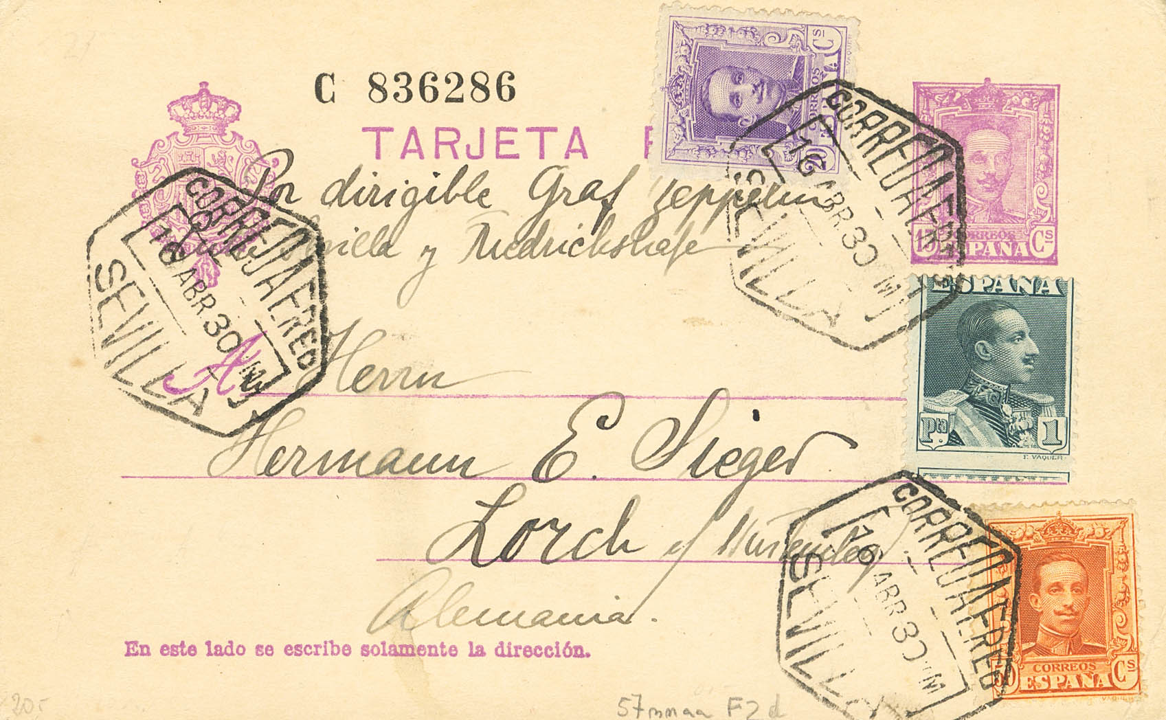 EP57, 316, 320, 321. 1930. 15 cts violet on Postal Card from SEVILLE to LORCH (GERMANY), with complementary postage of 20 cts, 50 cts and 1 pts. On the front notation "By Graf Zeppelin airship" but finally transported by Air through Paris. MAGNIFICENT.
