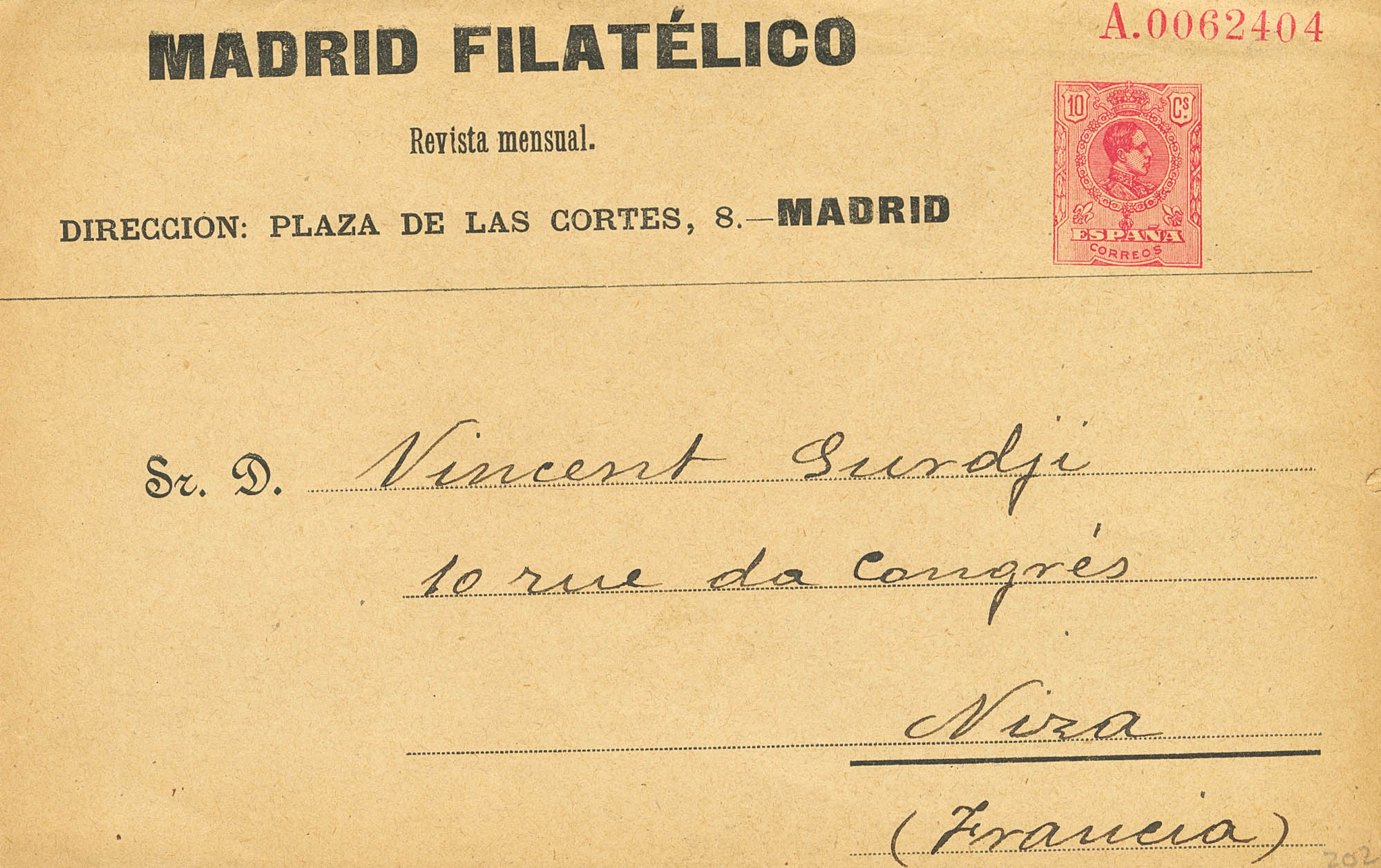(★) EP202. 1910. 10 cts pink on strip Whole Postal MADRID PHILATELIC. Written and uncirculated. MAGNIFICENT.