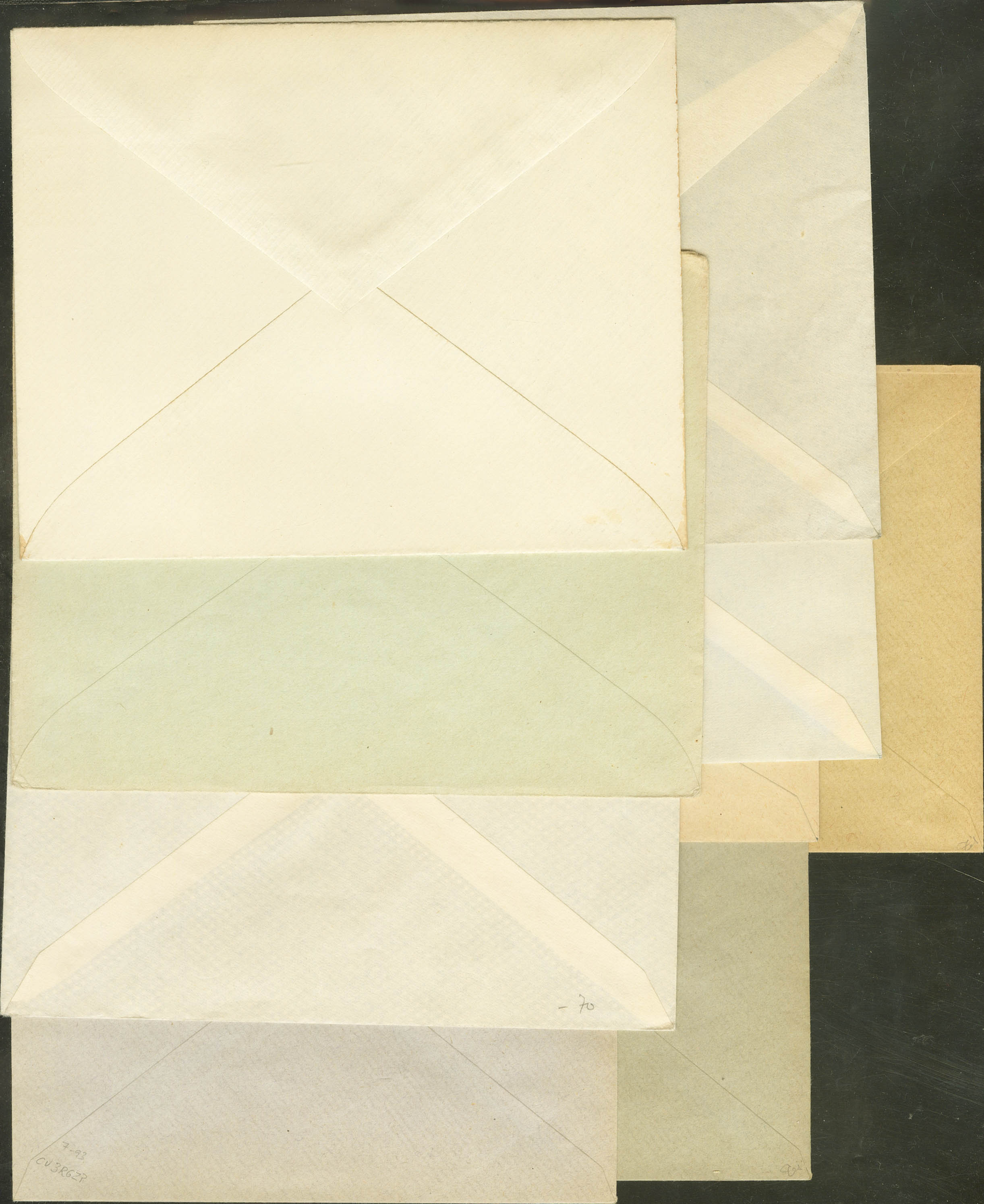 (★)1931. Interesting set of nine Entero Postal Private envelopes (without letterhead) of the values of 2 cts olive, 5 cts chestnut lilac, 15 cts blue green, 25 cts red, 30 cts chestnut, 40 cts blue, 50 cts orange and 1 pts black ( 158x127). MAGNIFICENT AND RARE SET. (Láiz 2006 Nº913, 925, 929, 932, 937, 949, 965, 970, 972, 920 Euros)