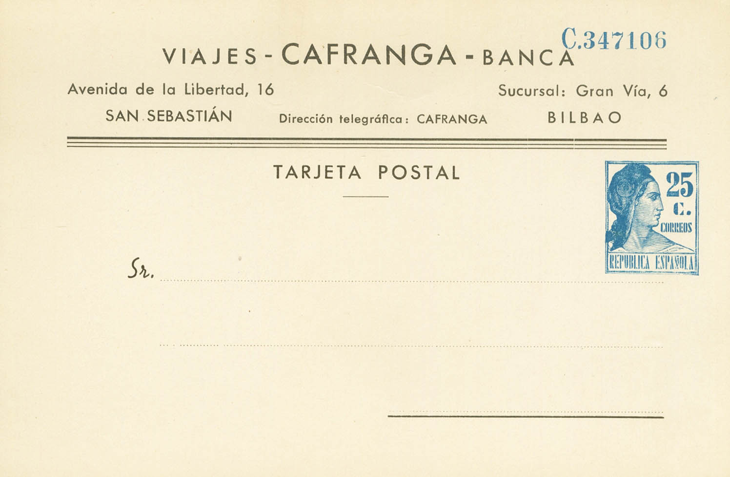 (★) EP1077. 1935. 25 cts blue on CAFRANGA Private Postal Whole Card. MAGNIFICENT. (Láiz 2006, 210 Euros)
