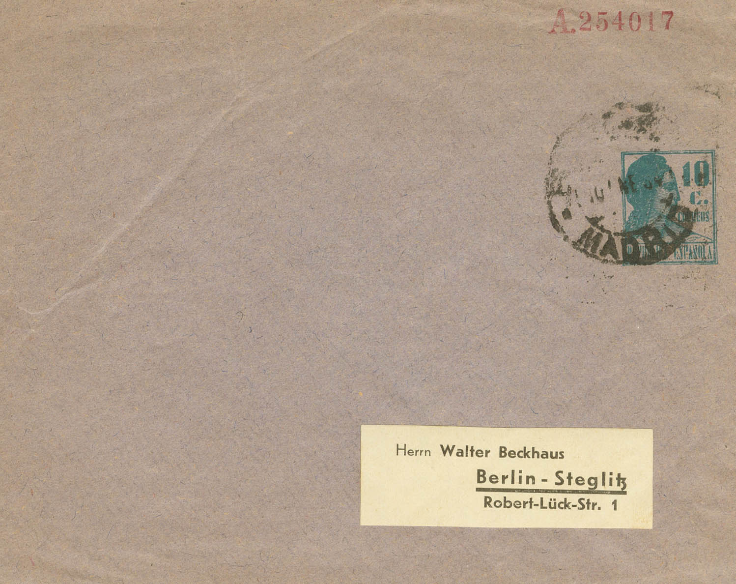 EP1168. 1934. 10 cts verde sobre Entero Postal Privado (sin membrete) de MADRID a BERLIN (ALEMANIA). MAGNIFICO. (Láiz 2006, 180 Euros)