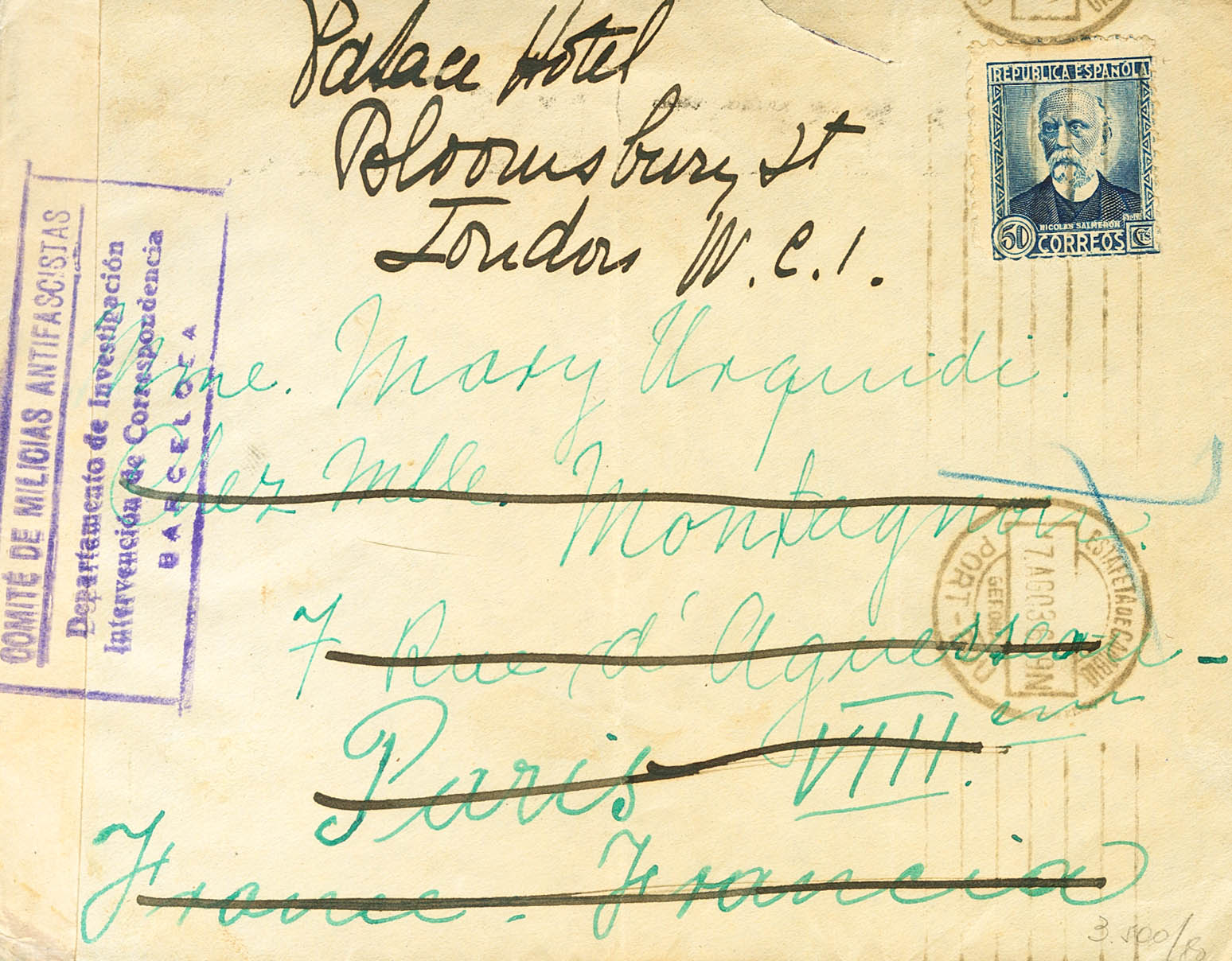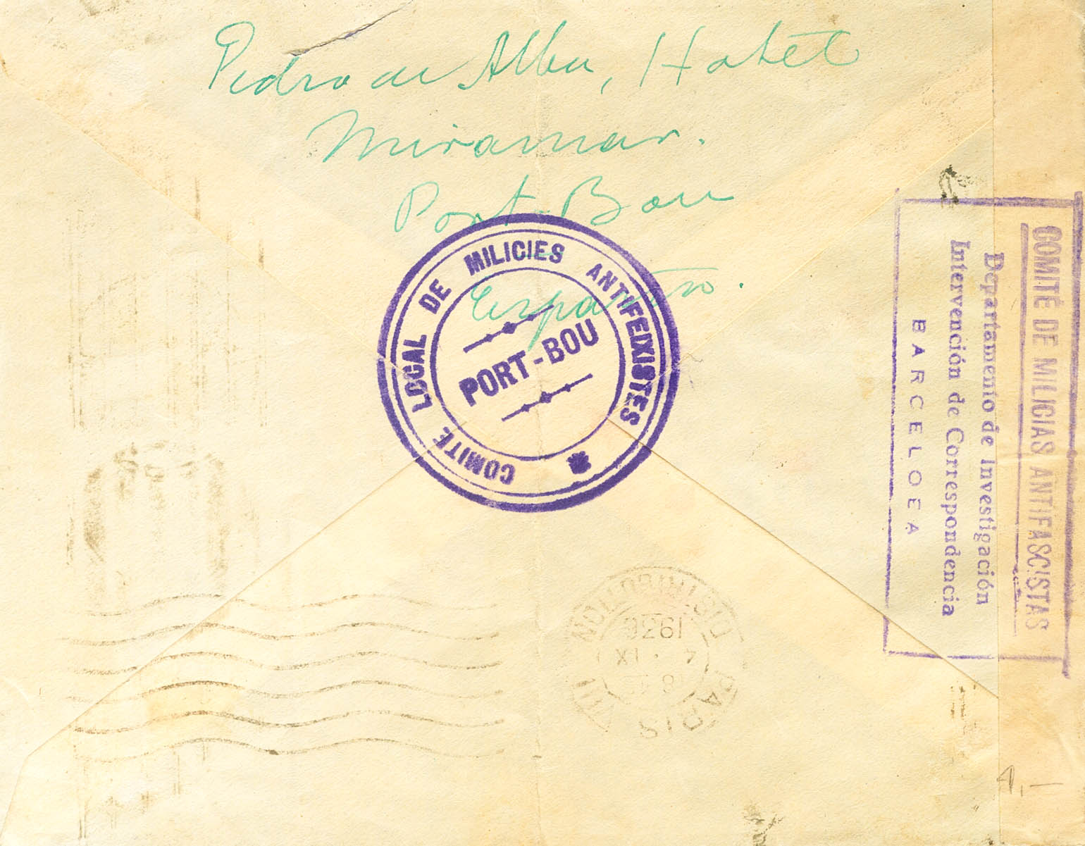 1936. 50 cts azul. PORT BOU (GERONA) a PARIS (FRANCIA), reexpedida a LONDRES (GRAN BRETAÑA). En el frente marca COMITE DE MILICIAS ANTIFASCISTAS / DEPARTAMENTO DE INVESTIGACION / INTERVENCION DE CORRESPONDENCIA / BARCELONA, en violeta y al dorso marca COMITE LOCAL DE MILICIES ANTIFEIXISTES / PORT BOU, en violeta y llegada. MAGNIFICA Y RARISIMA MARCA DE MILICIAS DE PORT BOU.