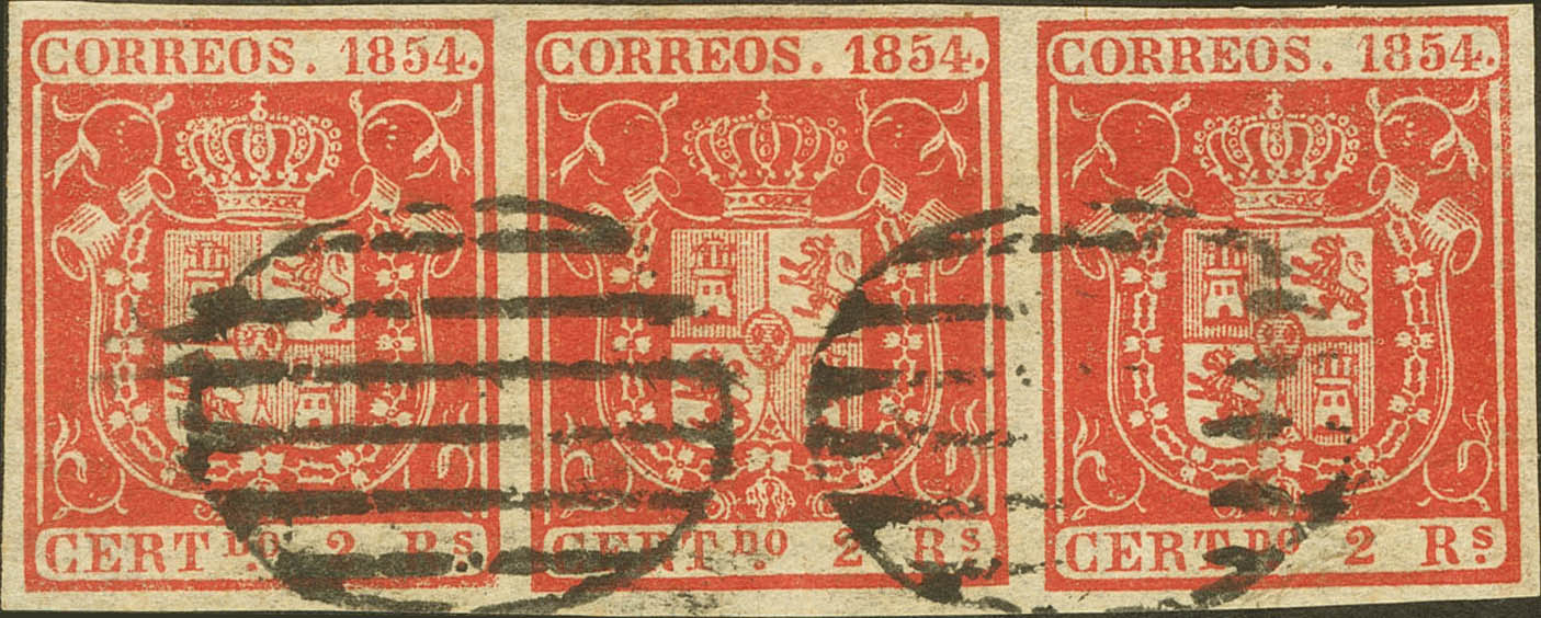 25(3). 1854. 2 reales red, strip of three. MAGNIFICENT AND SPECTACULAR. Edifil 2020: +++400 Euros