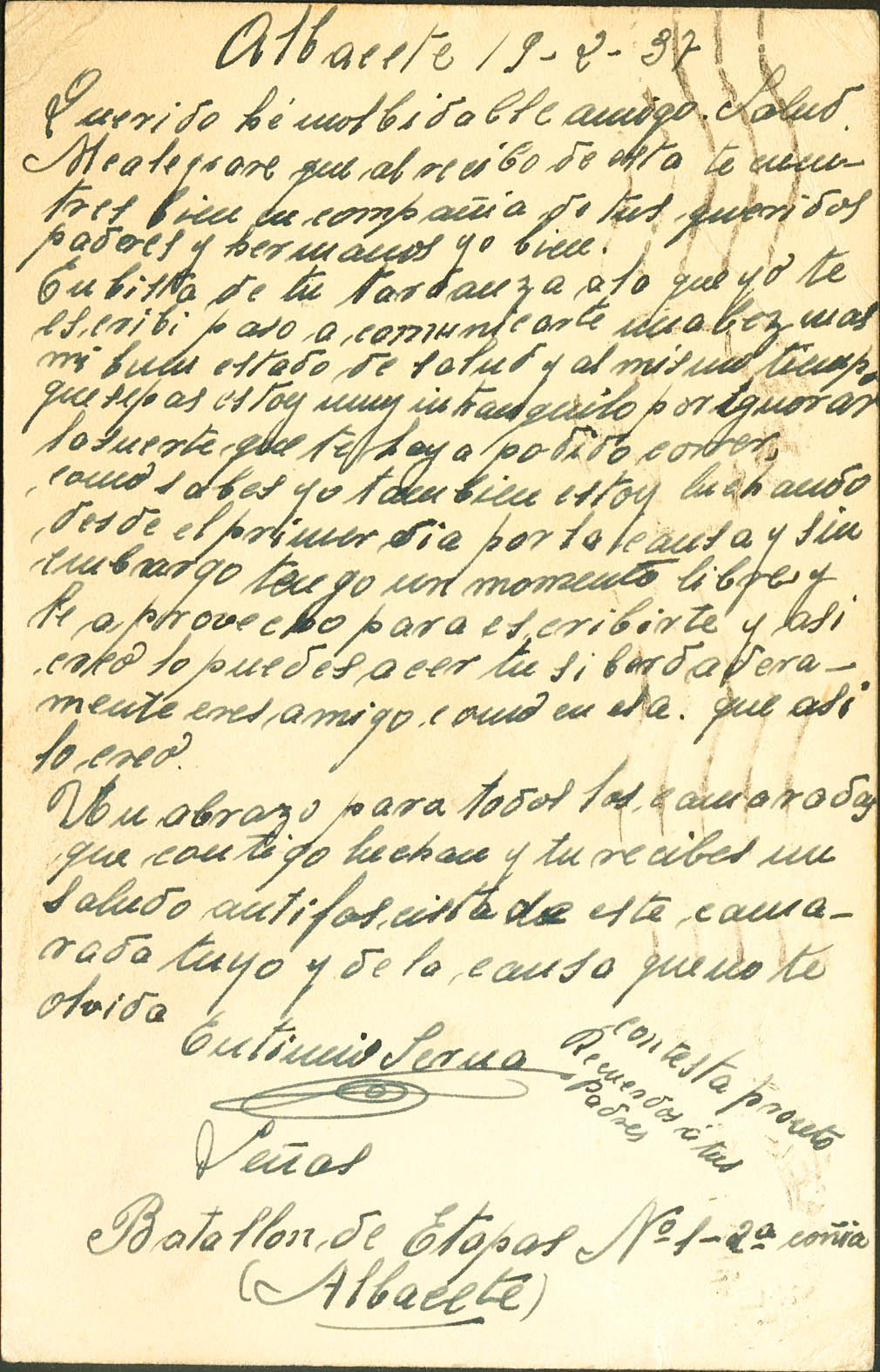 1937. Tarjeta Postal de Campaña del P.S.O.E. con tres viñetas de 10 cts del S.R.I. ESTE SIMBOLO DIGNIFICARA Y RECONSTRUIRA ESPAÑA. ALBACETE a ARIJA (BURGOS). MAGNIFICA Y RARISIMA. (Allepuz 205)