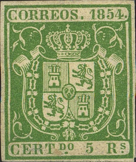 ★ 26. 1854. 5 reales green. Intense color. MAGNIFICENT. Cert. COMEX.