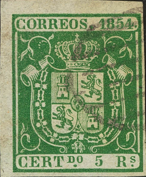 26. 1854. 5 reales green, corner of sheet. Intense color and very sharp printing. LUXURY PIECE.