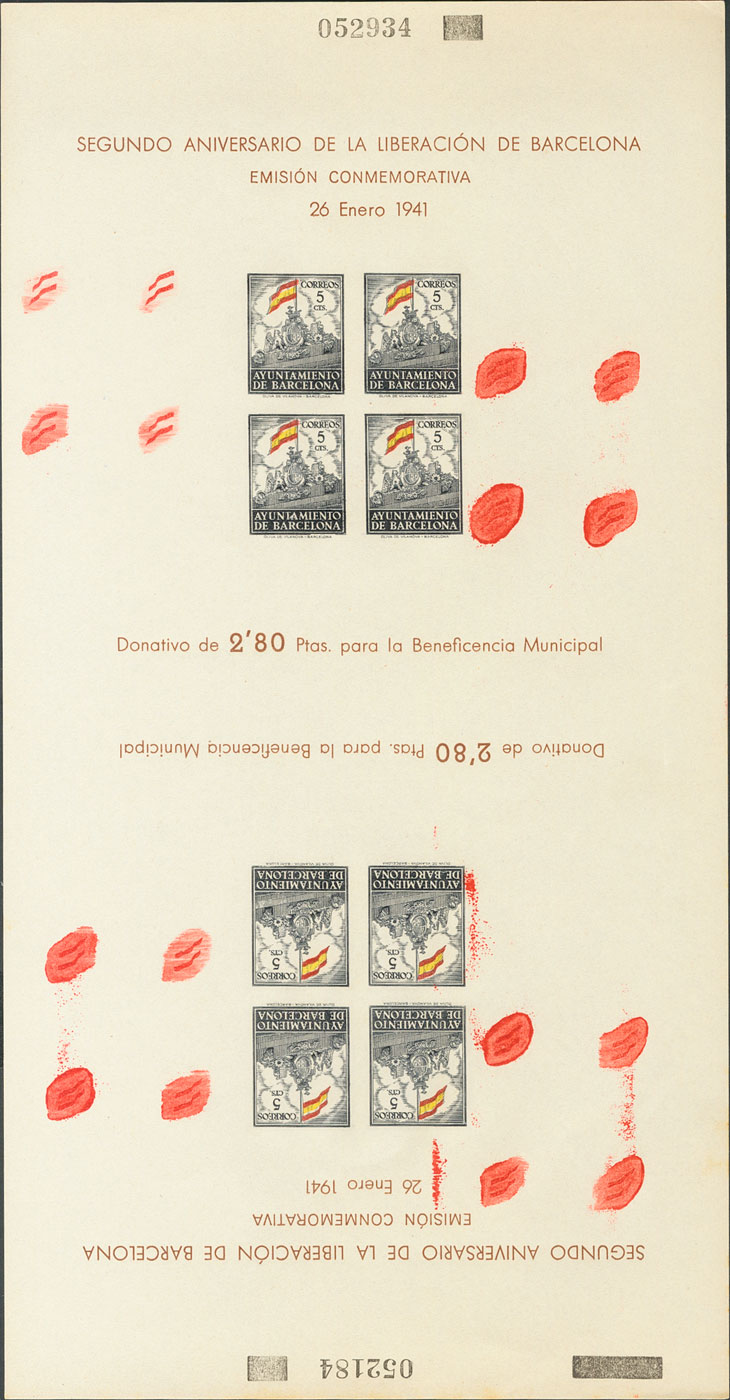 (★) 30s(2). 1941. 5 cts black, red and yellow, block leaves, in a capicúa pair (without guillotining). UNTOOTHED and PRINTING OF THE FLAGS ON THE SIDES (pasted in red). MAGNIFICENT AND RARE.