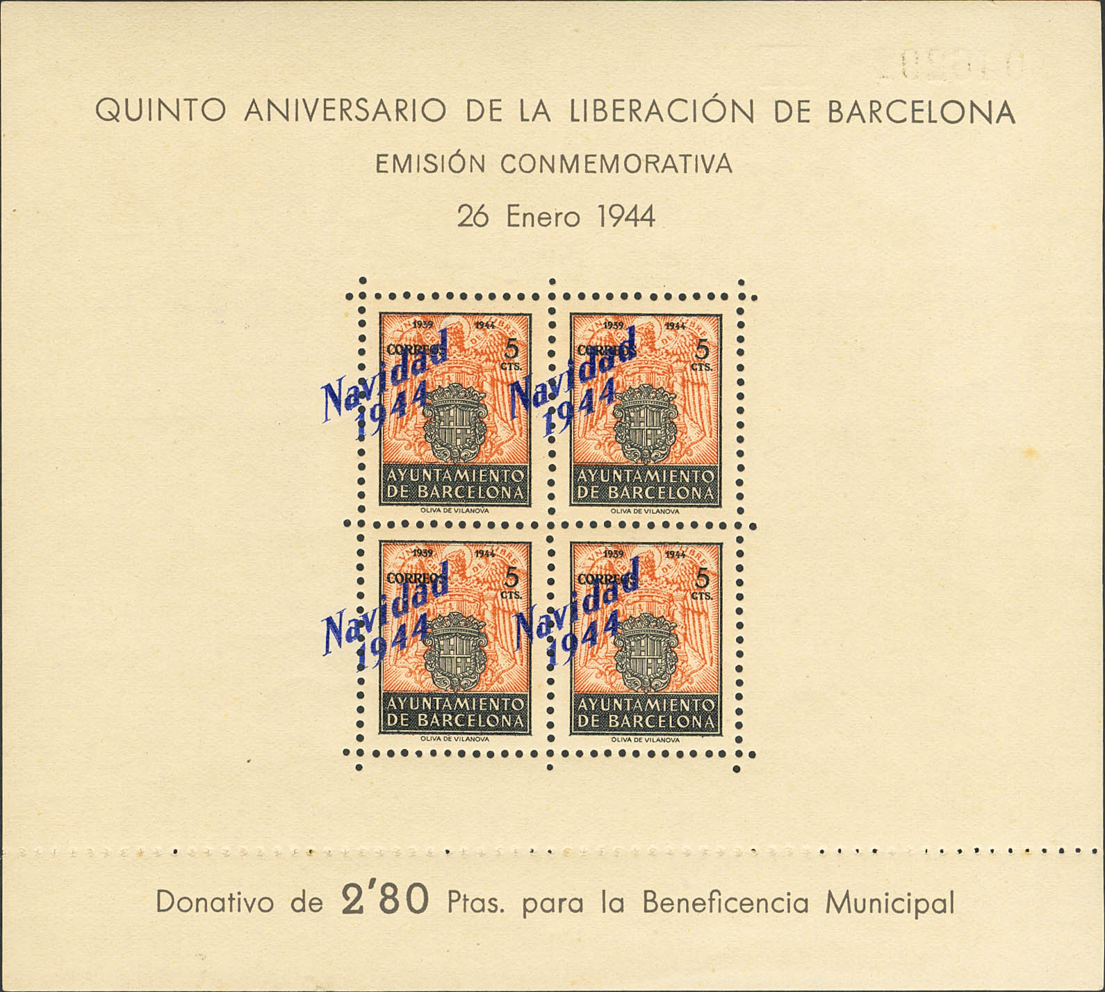 ★★ NE25. 1944. 5 cts negro y naranja NO EMITIDA, hoja bloque. SOBRECARGA DESPLAZADA. MAGNIFICA.