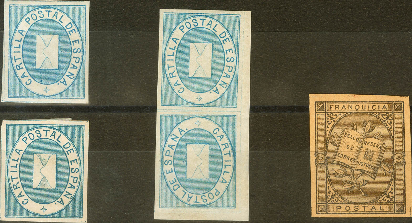 ★/(★) 1(2), 1aiia, 7. 1867. Conjunto de cuatro sellos de Franquicia Postal de 1869 (dos sueltos y una pareja capicúa) y uno de 1881. MAGNIFICOS. Edifil 2017: 396 Euros