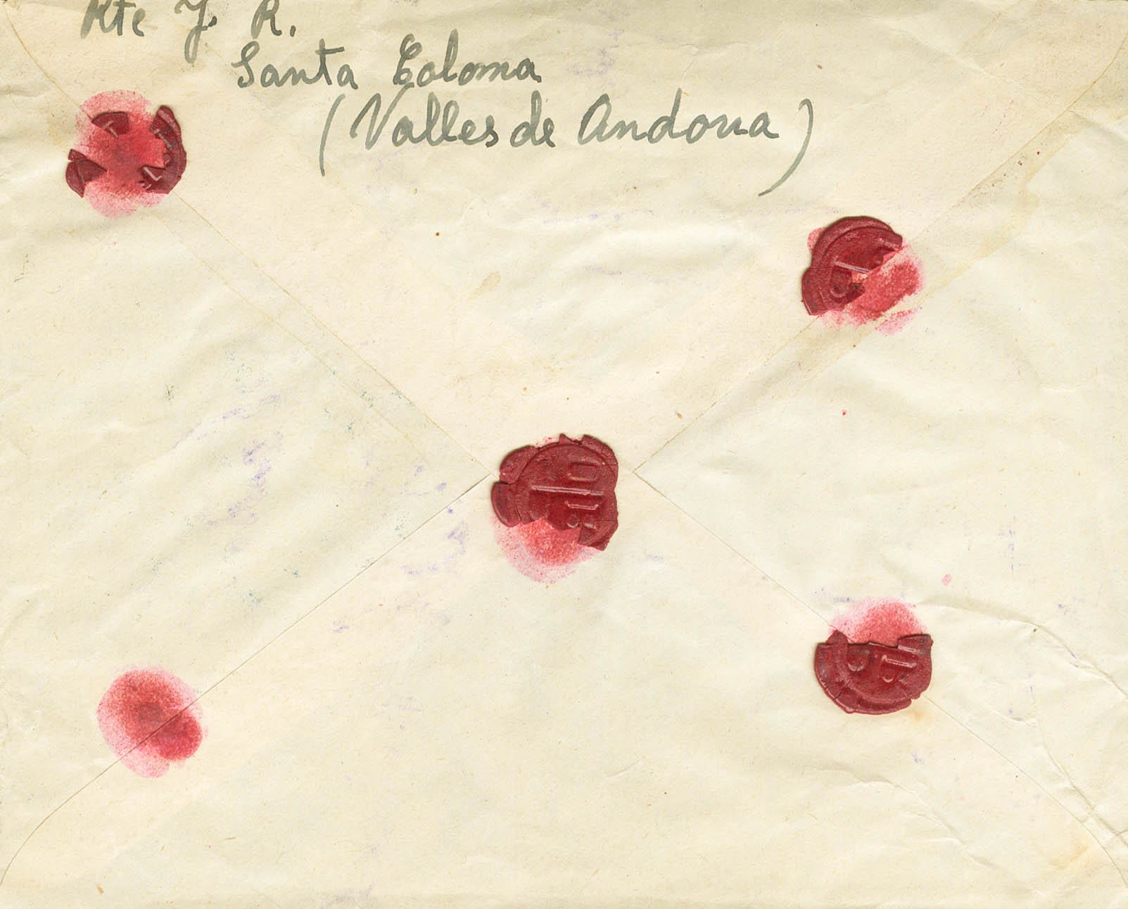 1946. Stamps from Spain of 40 cts green gray and 10 cts carmine, in pairs. Certificate from SANTA COLOMA to VALENCIA DEL VENTOSO (BADAJOZ). Postmark ANDORRA / POST OFFICE / SANTA COLOMA. MAGNIFICENT.