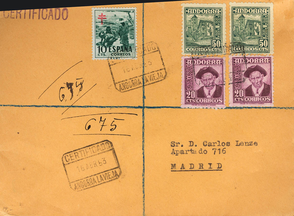 48(2), 51(2). 1953. 20 cts lila, dos sellos, 50 cts verde oliva, dos sellos y 10 cts verde de España. Certificado de ANDORRA LA VIEJA a MADRID. Al dorso llegada. MAGNIFICA.