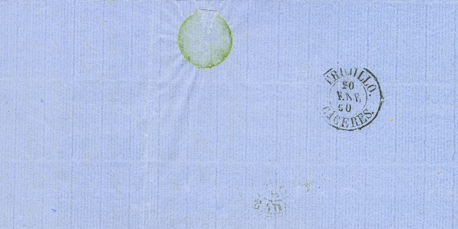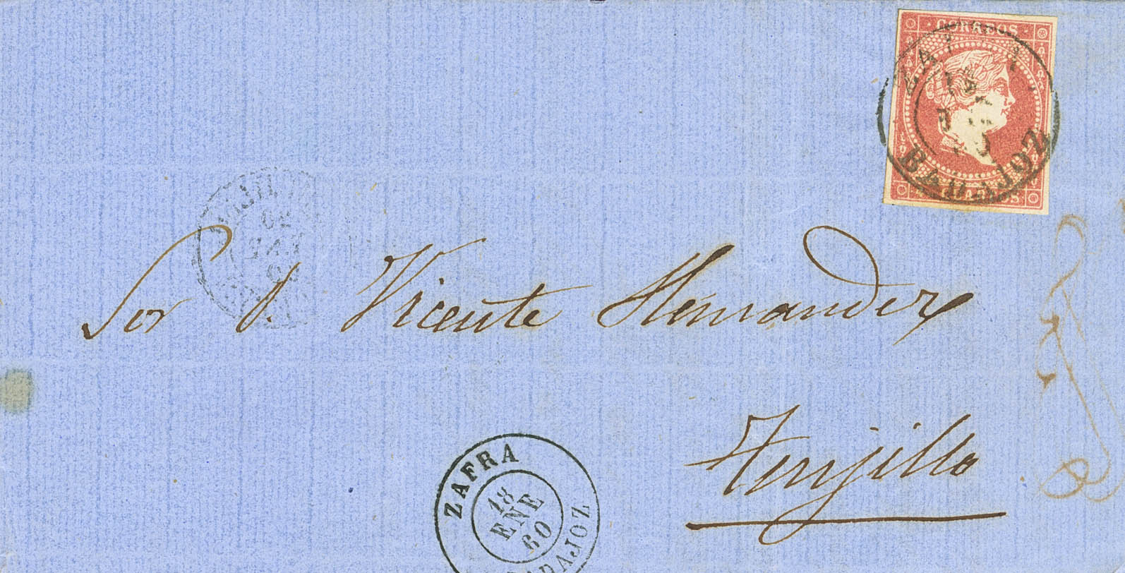 48. 1860. 4 cuartos red. ZAFRA to TRUJILLO. ZAFRA / BADAJOZ postmark (Type I), next to the Type II date stamp. MAGNIFICENT.